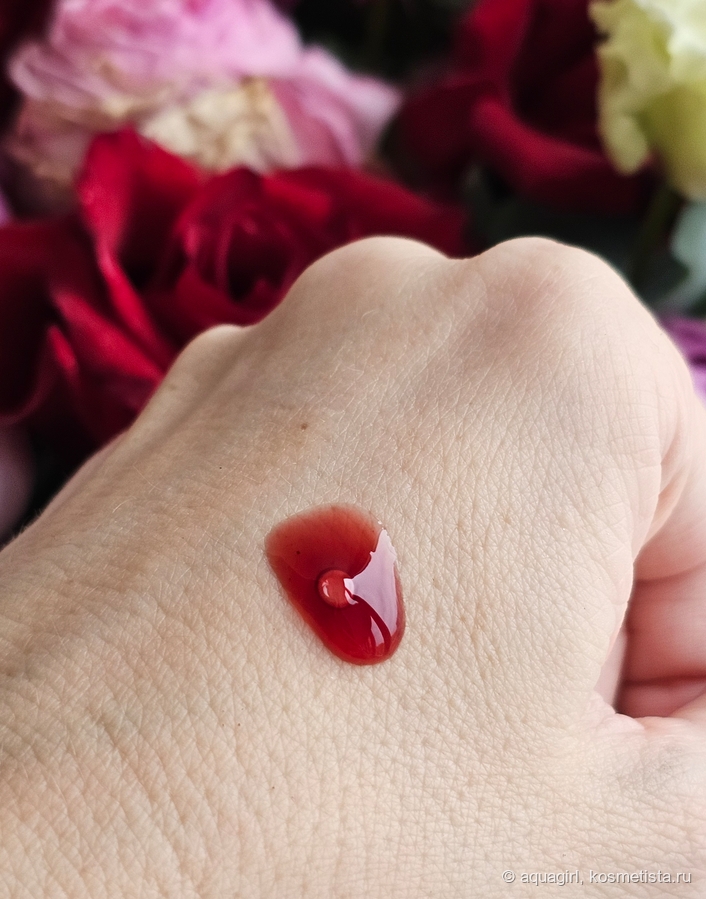 Внутри тёмно-красная жидкость с запахом косметических кислот.