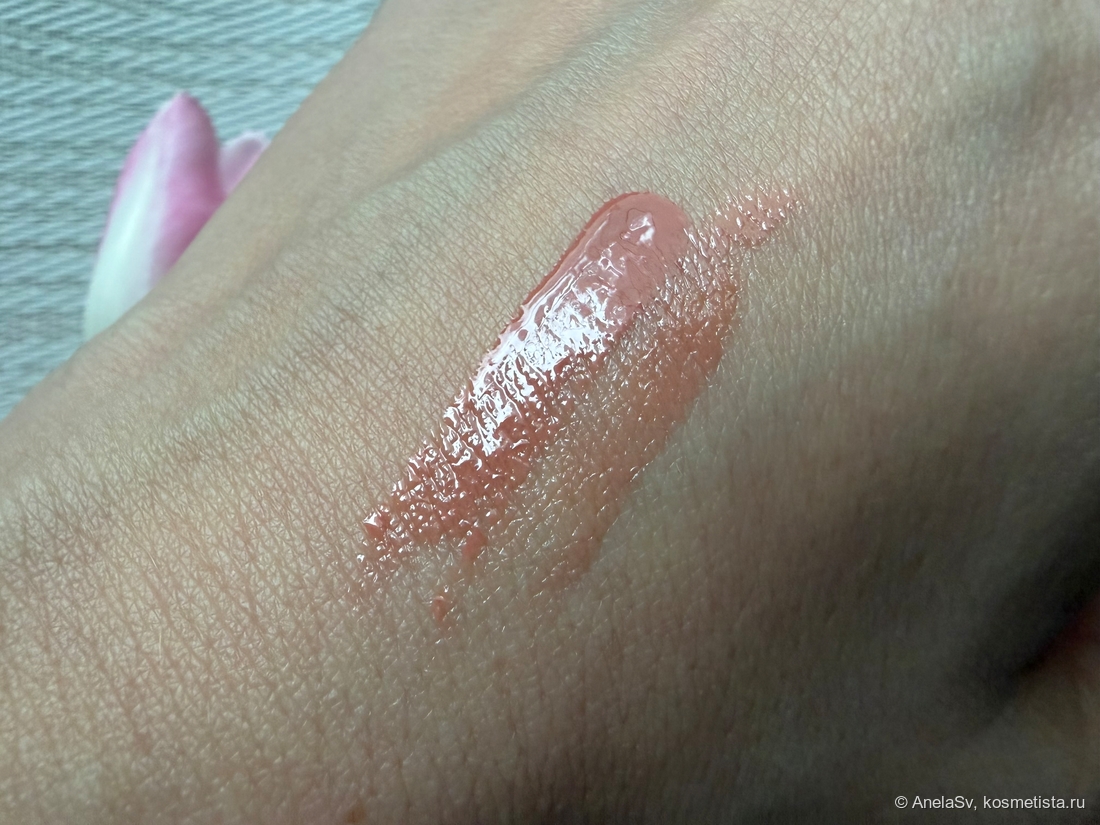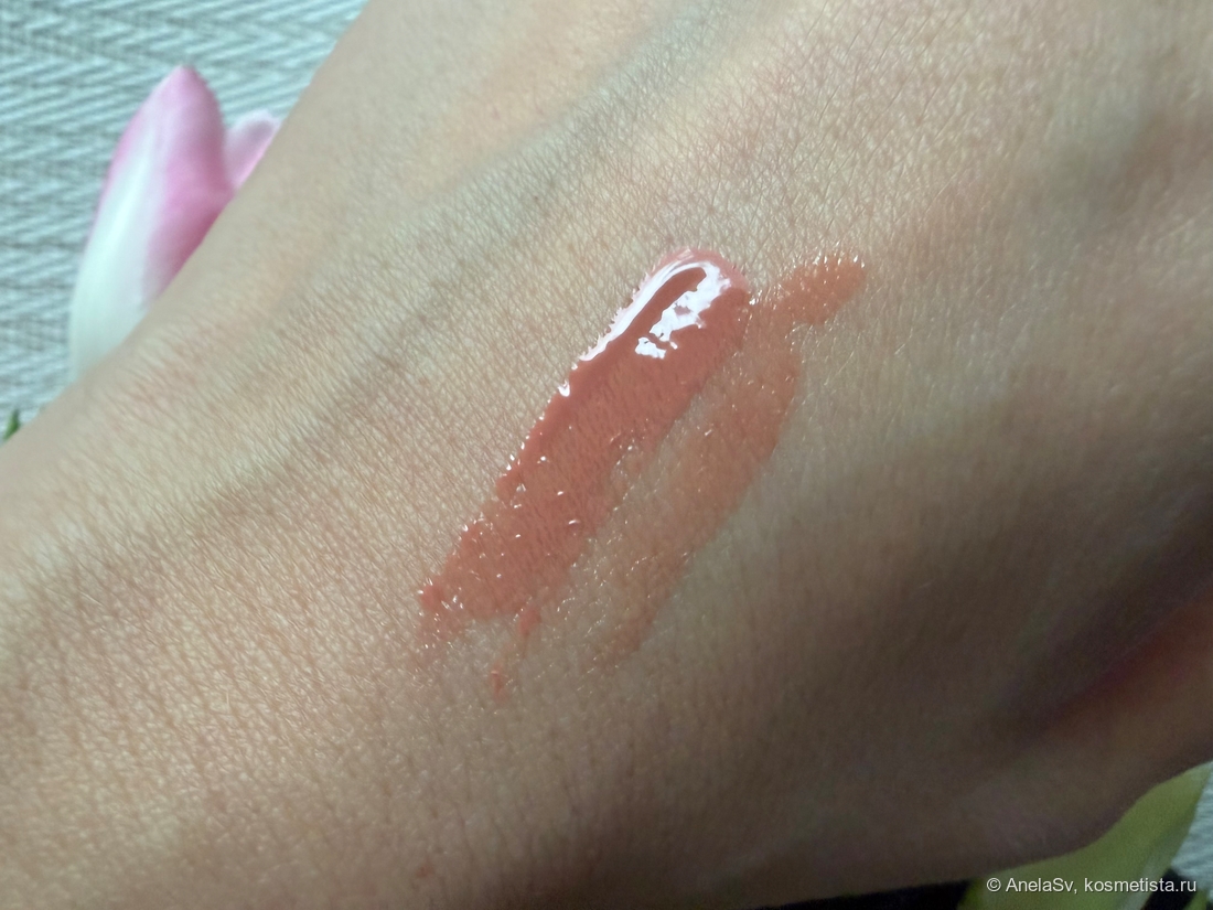 Мой оттенок — Seduction, тёплый бежевый нюд. Цвет универсальный, но на губах может слегка высветлять их естественный тон. Текстура довольно густая, распределяется не слишком легко — нужно аккуратно растягивать по поверхности, иначе появляются неровности. Если переборщить со слоем, блеск ложится полосами. Аромат сладковатый, карамельный, но после нанесения практически не ощущается.