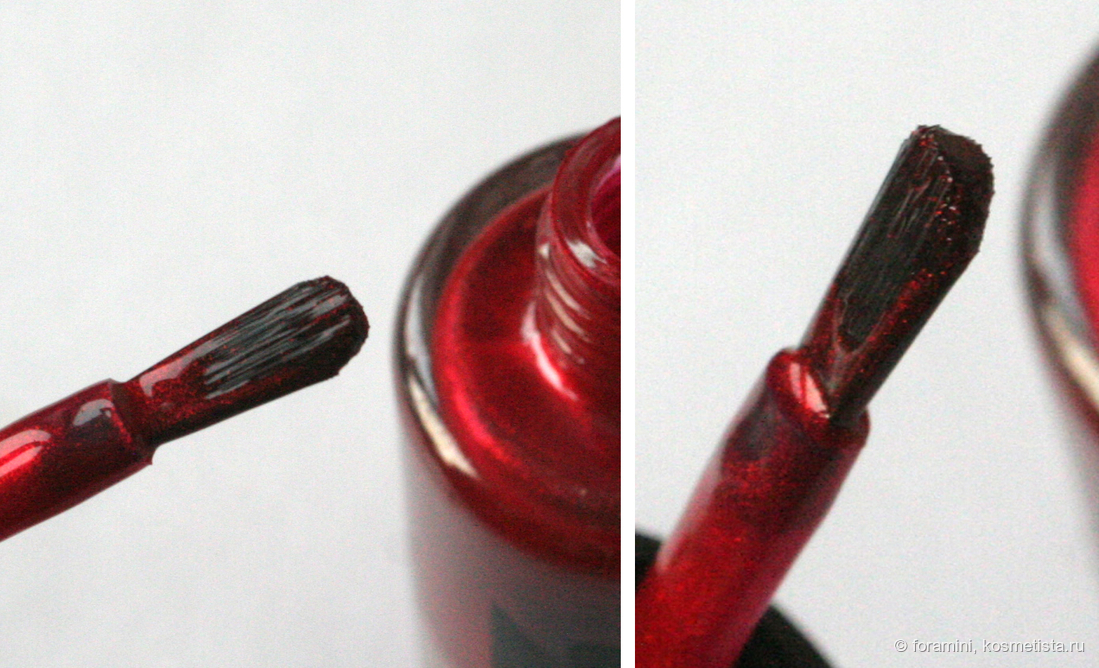 Кисточка в лаке удобная, плоская с полукруглым срезом. Отмечу также, что крышка у лака новая, полуматовая без покрытия софт-тач, со временем не будет становиться липкой.