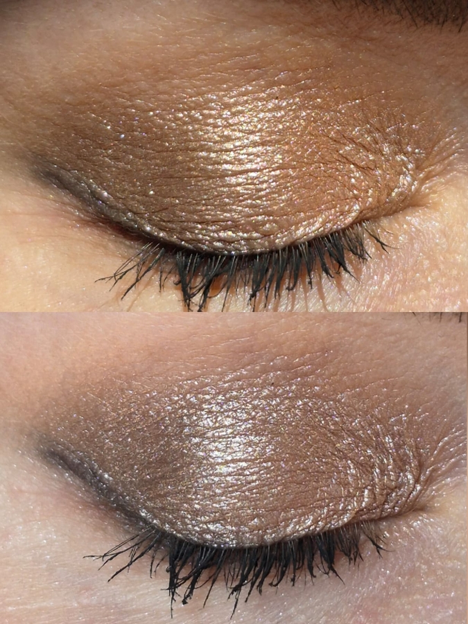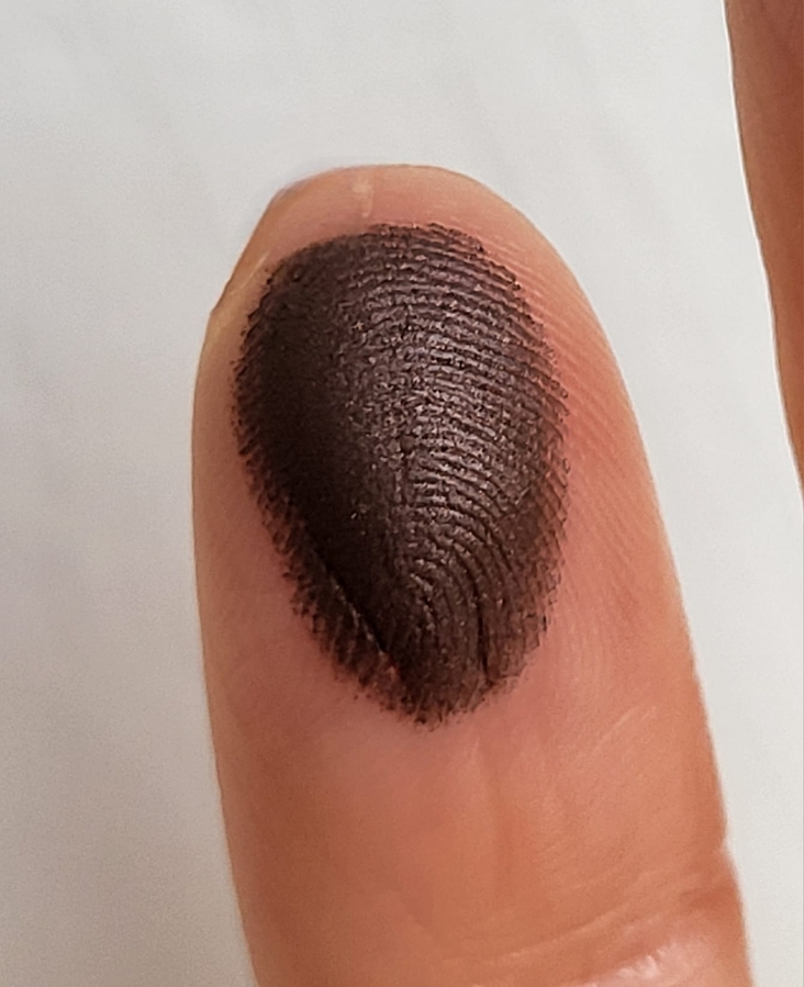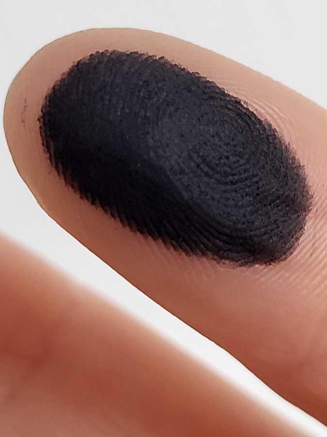 На самом деле в макияже добиться угольно чёрного не получится, оттенок скорее уходит в антрацит — есть сероватый подтон. Зато если делать смоки — он великолепно создает дымку и или выделяет ресничный край. При переносе узкой кистью для подводки не осыпается, при попытке работать широкой — слегка, очень слегка пылит. Я бы не стала придираться, работать с ним очень легко.
