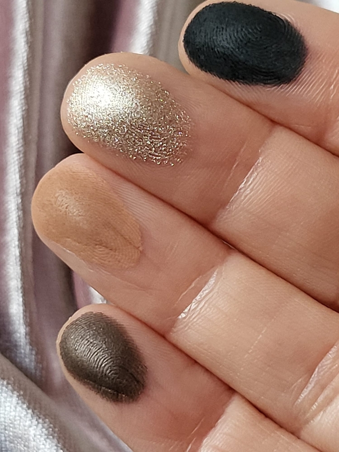 Свотчатся они чудесно! Тени пудровые, шелковистые, легко набираются на палец и так же легко ложатся на кожу. Покажу их поближе: