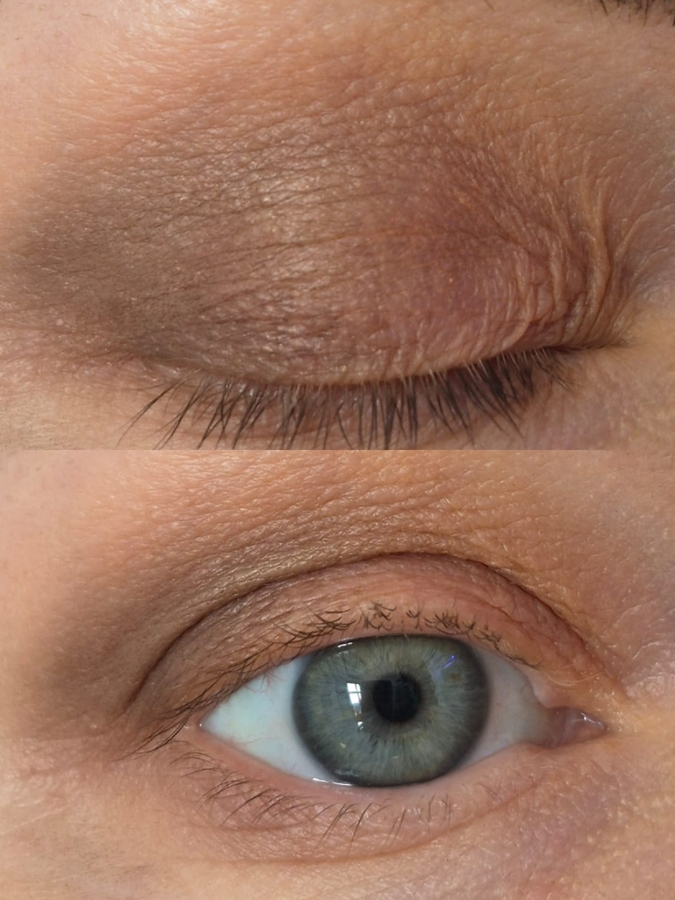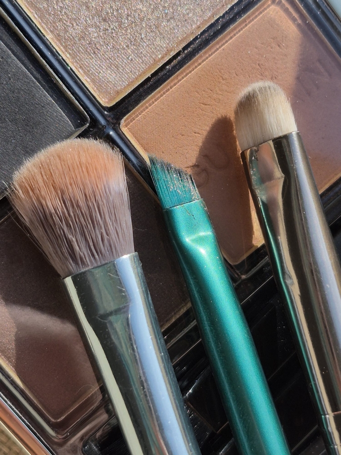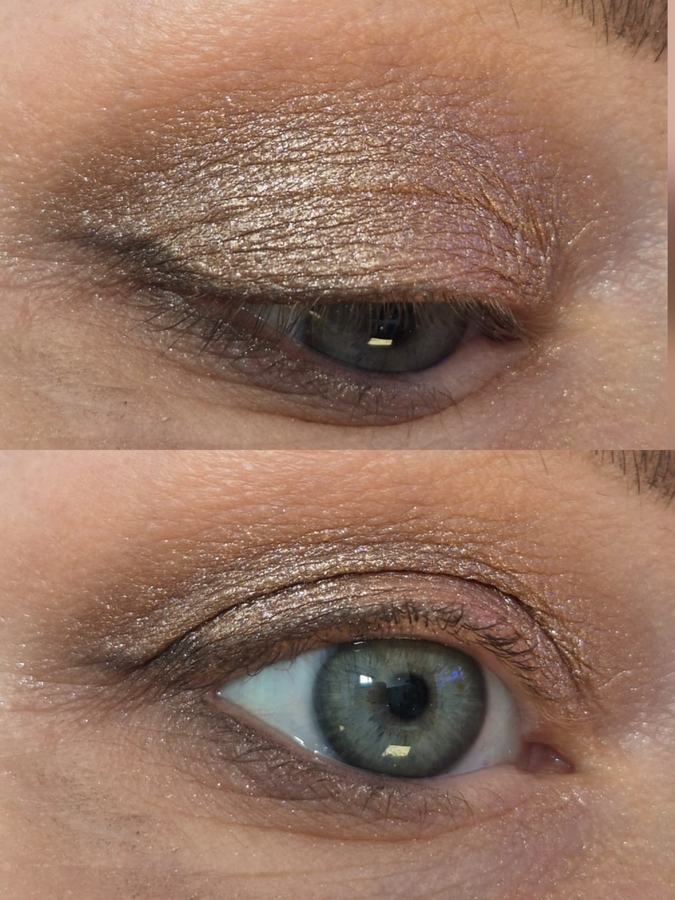2.Той же мощной кистью захожу в тёмно-коричневый и тушую наружную треть подвижного века, чуть заходя в складку века. Остатки на наружную треть нижнего века. Ничего не осыпается и снова всё легко тушуется!