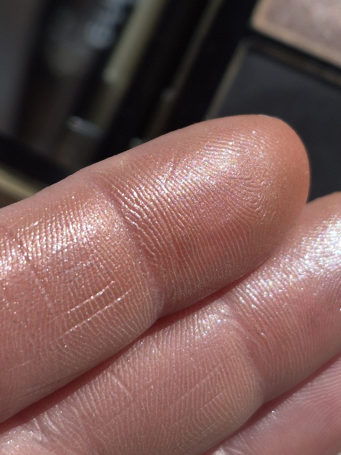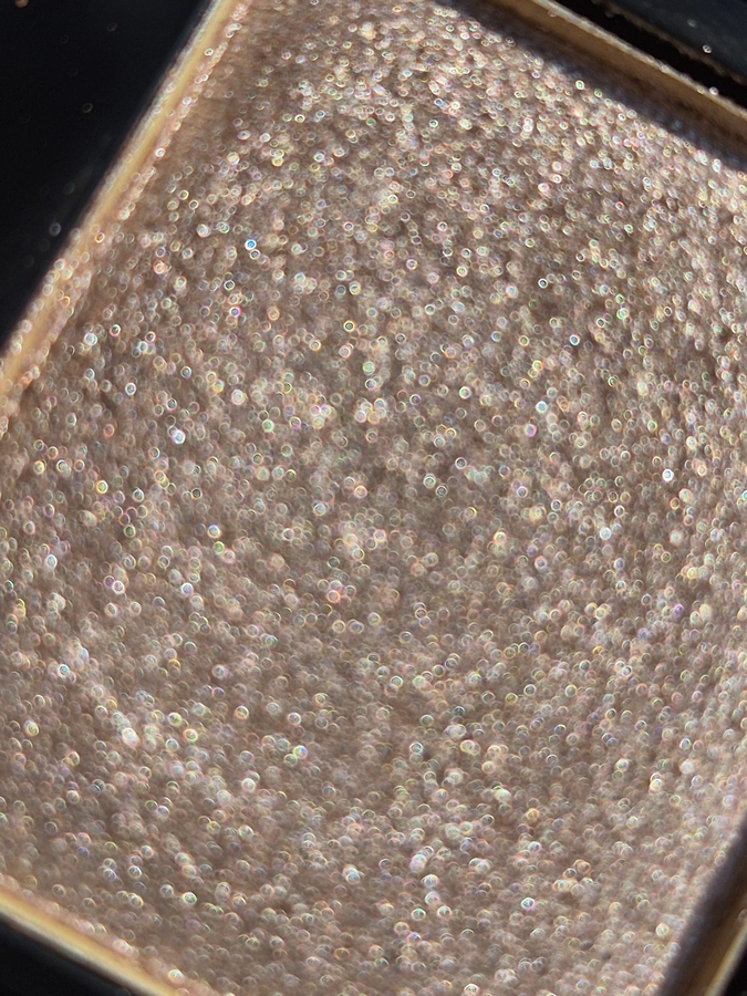 Красив. Состоит из серебристо-розовой, телесной прозрачной базы и миллиарда сверкающих микрочастичек. Ему нужно солнце или электрический свет! Самый мягкий в палетке, лучше всего наносится пальцем — в этом случае осыпаний ноль! Но если подтушевать кистью — единичные блёстки упадут под глаз. Но и этот оттенок не вызывет проблем в работе, его можно наслаивать до космического свечения, особенно если используете базу или клей.
