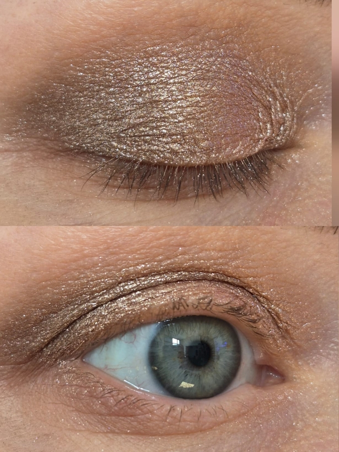 Несмотря на кажущуюся плотность и матовость в рефиле, создает красивое сатиновое свечение на веке и визуально сглаживает текстуру кожи. Не осыпается. Легко тушуется. Наслаивается. Идеальный.