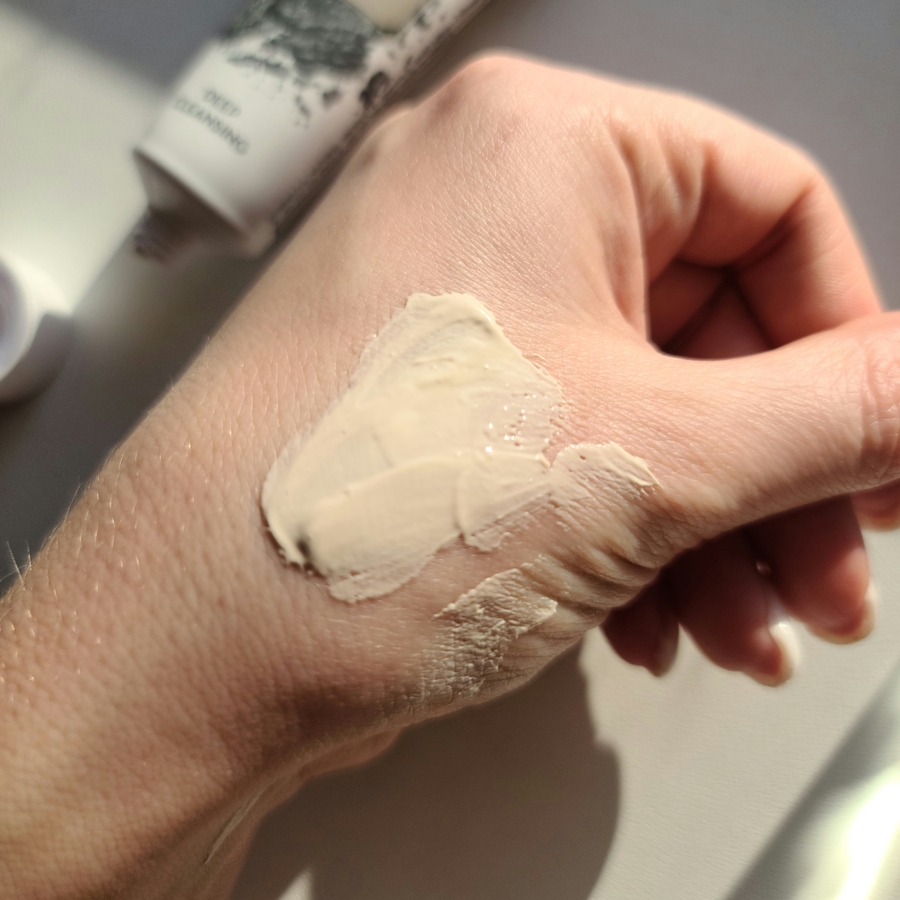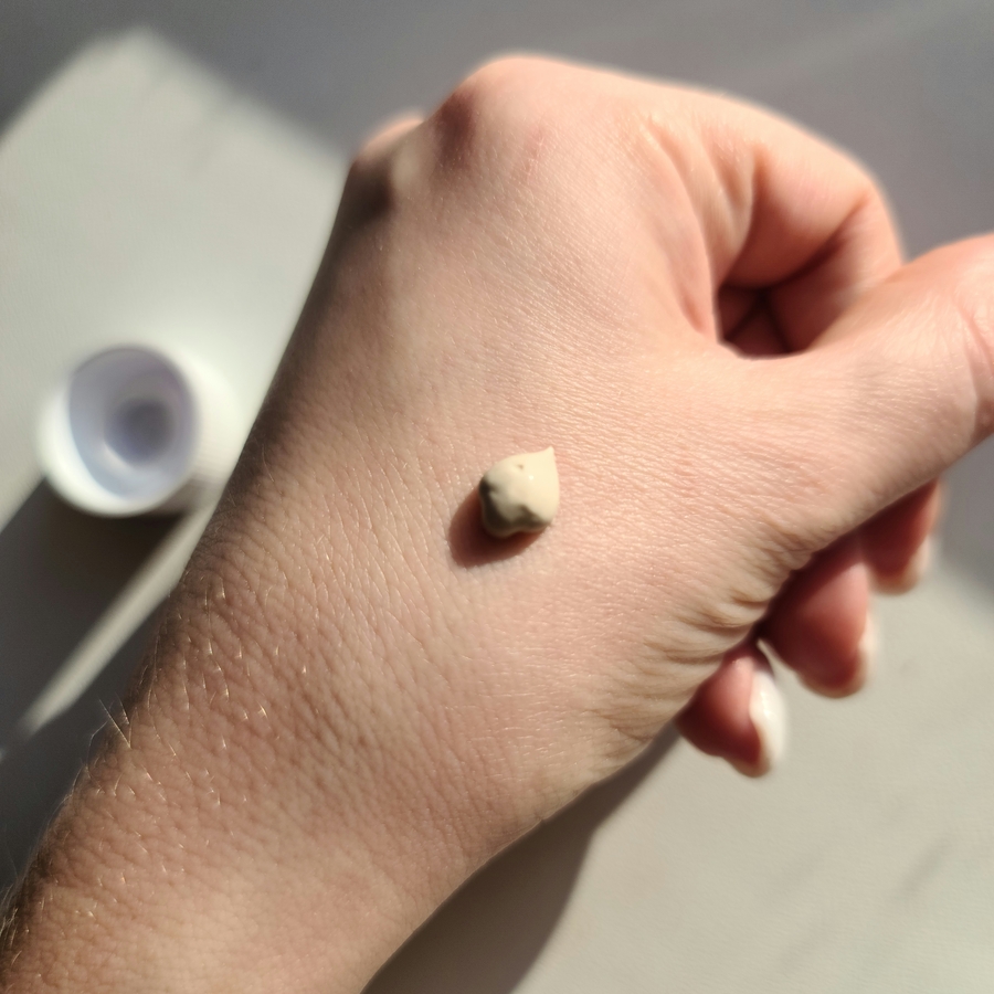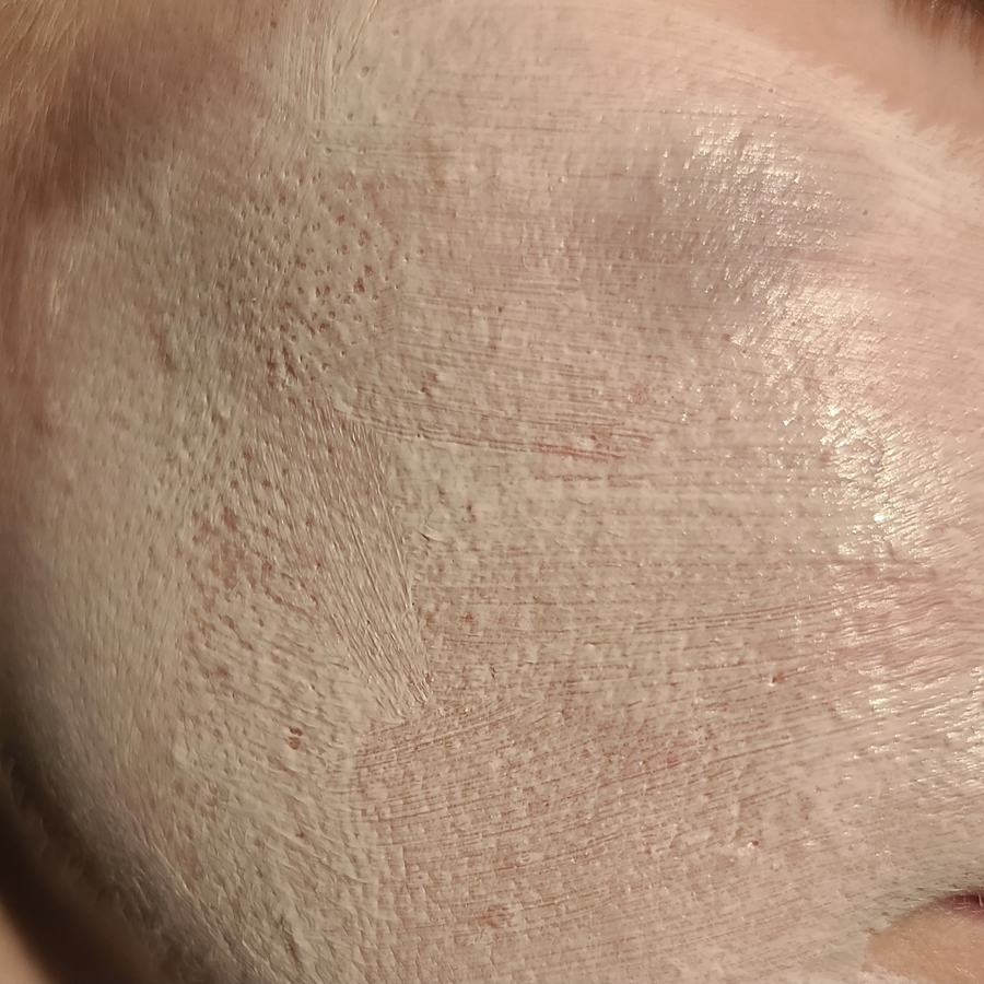 Консистенция у неё плотная, кремово-глиняная, с лёгким травяным ароматом.