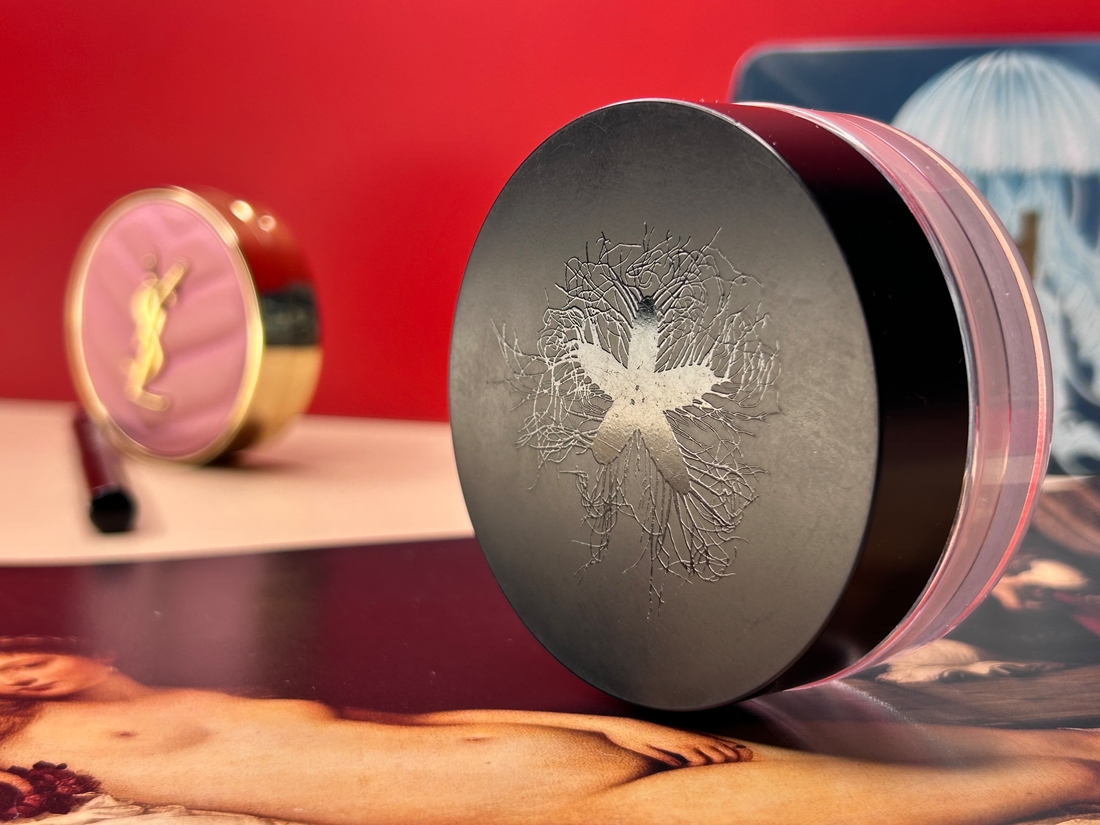 Продукт не имеет запаха и по сути — цвета. Да, пудра белая в баночке, но при растирании оттенок пропадает. У нее очень очень мелкий помол. На ощупь это нежный и шелковистый порошочек, который мгновенно блюрит кожу, матирует ее без эффекта маски или мучнистости. Делает кожу бархатной, убирая поры.