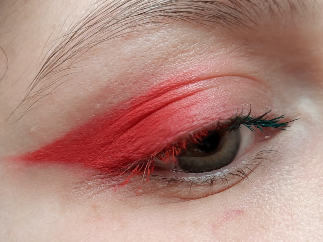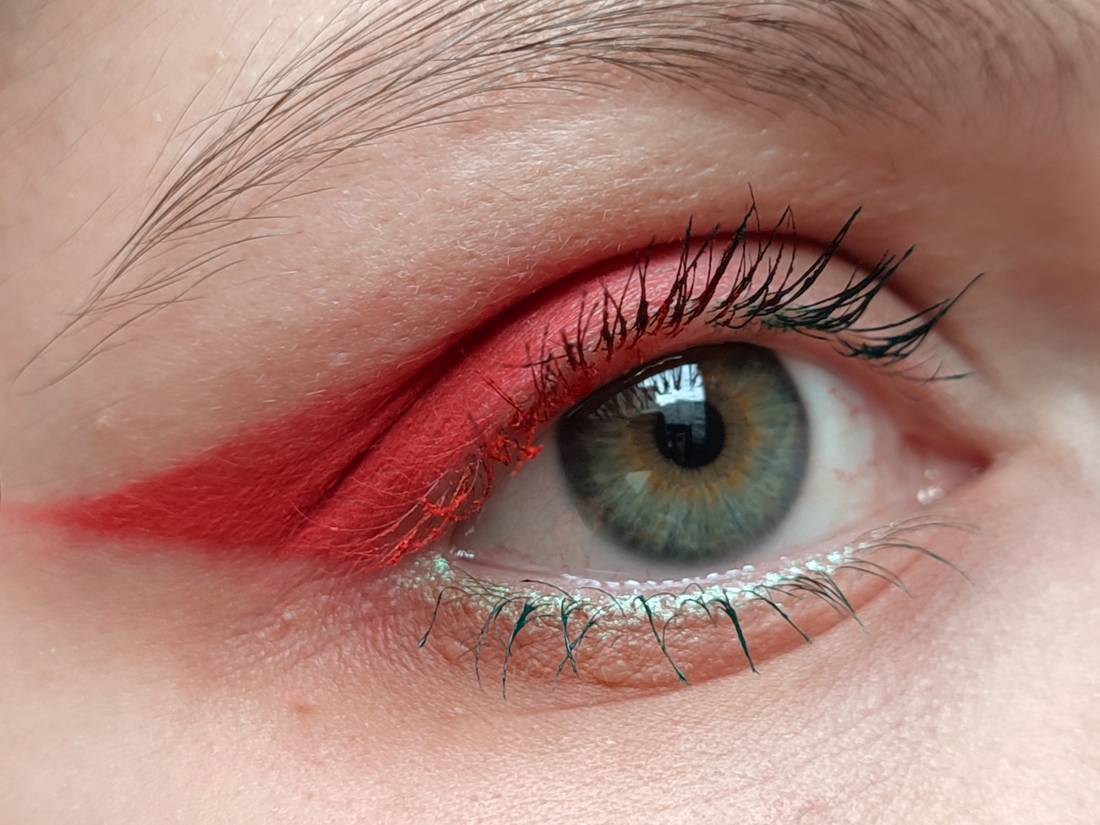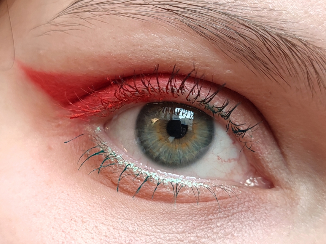 Далее импровизируем. Я не смогла определиться с цветом туши. Хочется все и сразу. Ну, так тому и быть. Ресницы у внешнего уголка крашу красным, у внутреннего — зелёным. Посередине как-нибудь сами смешаются.