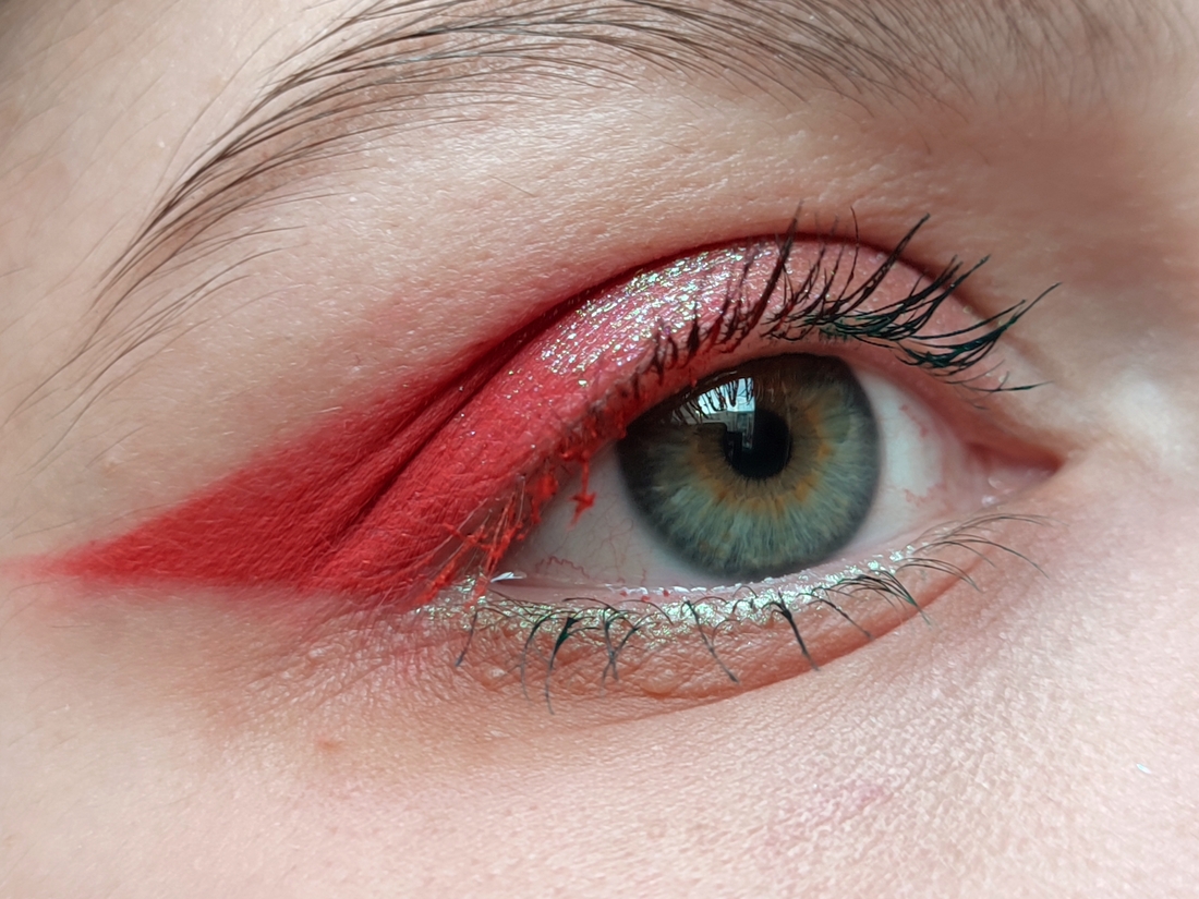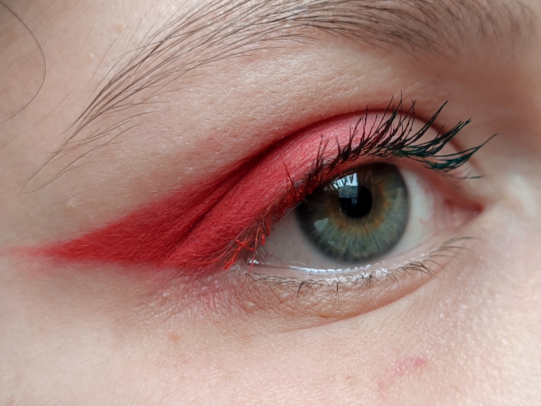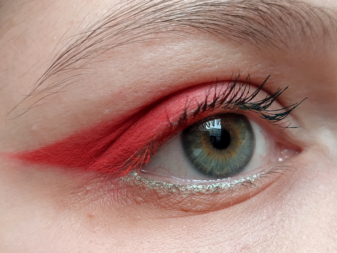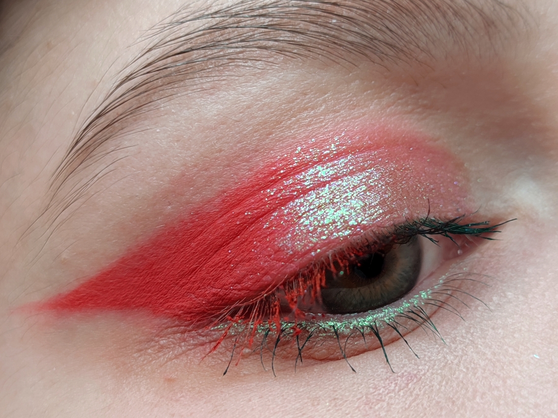 Далее импровизируем. Я не смогла определиться с цветом туши. Хочется все и сразу. Ну, так тому и быть. Ресницы у внешнего уголка крашу красным, у внутреннего — зелёным. Посередине как-нибудь сами смешаются.