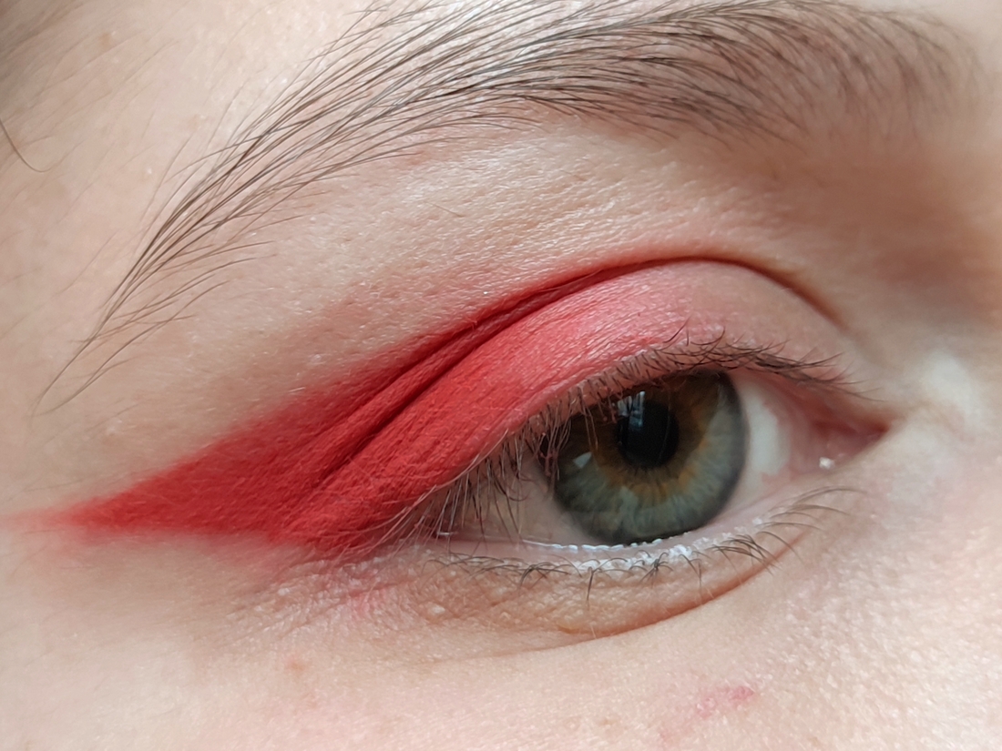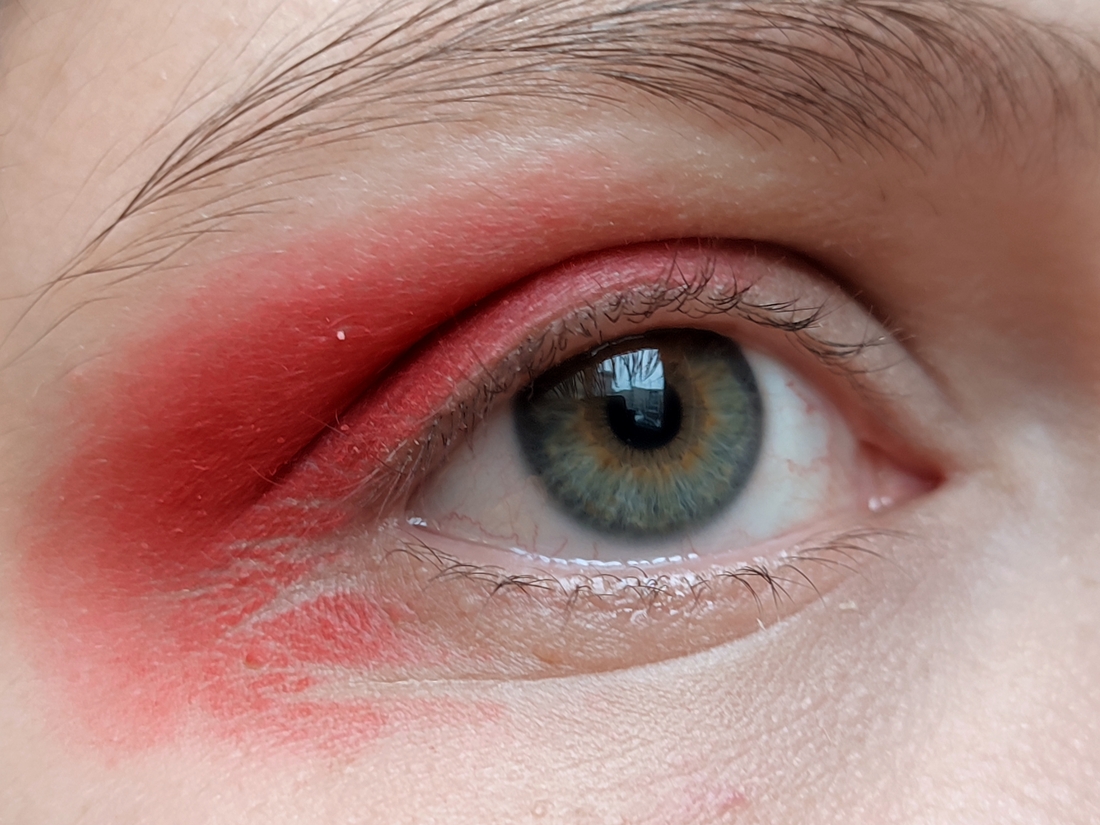 Теперь нужно натыкать пальцем красный цвет. Тык. Особо можно не аккуратничать, кроме места на подвижном веке, где цвет будет уходить в кожу.