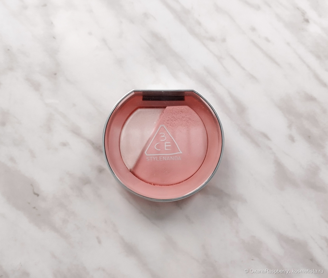 Румяна имеют шелковистую текстуру, легкую пигментацию и очаровательный нежно-розовый оттенок. Изначально палетка была куплена исключительно ради них. Но хайлайтер мне тоже понравился. Он вполне деликатный, несмотря на наличие отдельных сверкающих частиц.