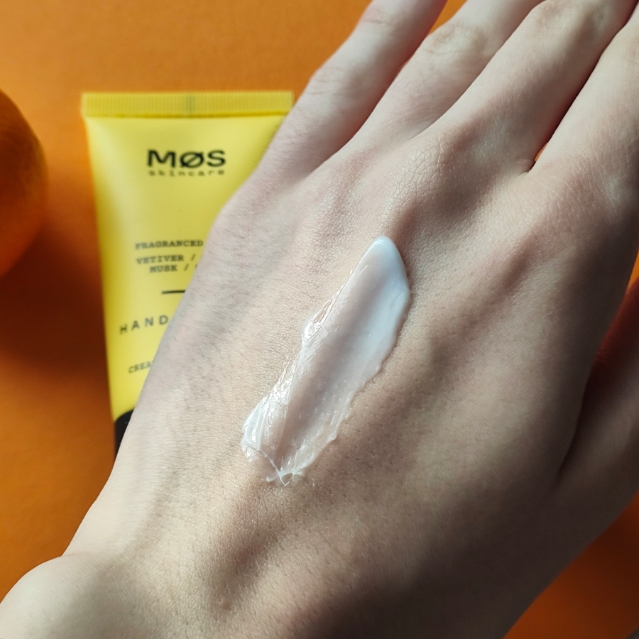 Цвет крема белый. По текстуре он не очень жирный, легко распределяется по рукам и очень быстро впитывается, не оставляя липкости и неприятных ощущений. Хорошо увлажняет кожу рук, а аромат держится в течение часа точно.