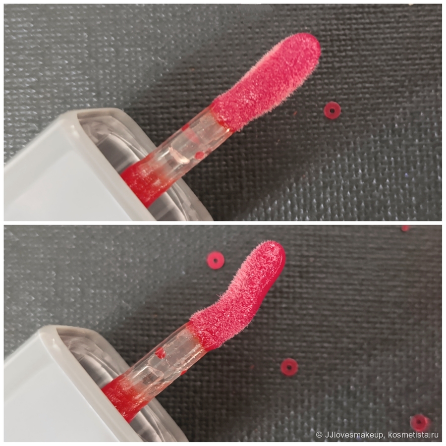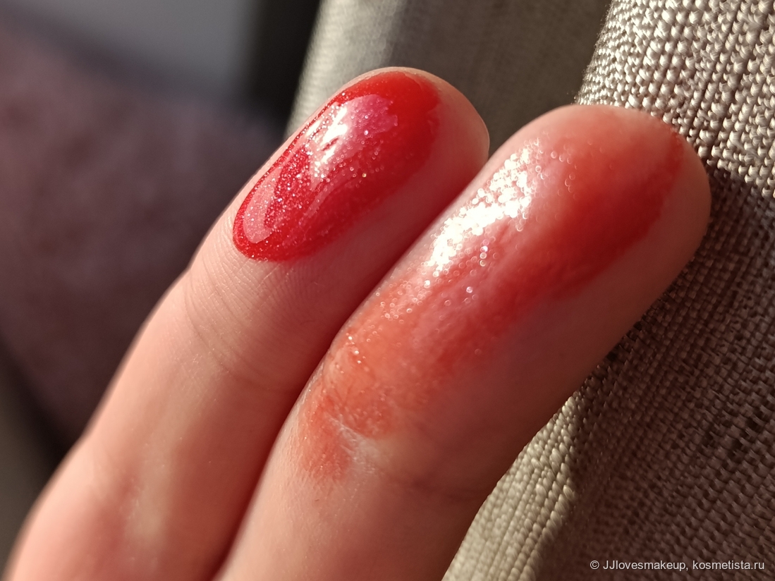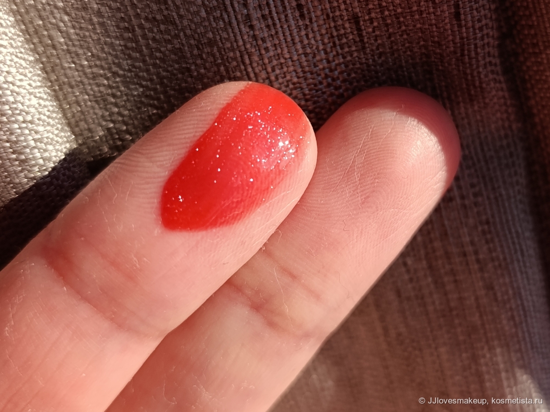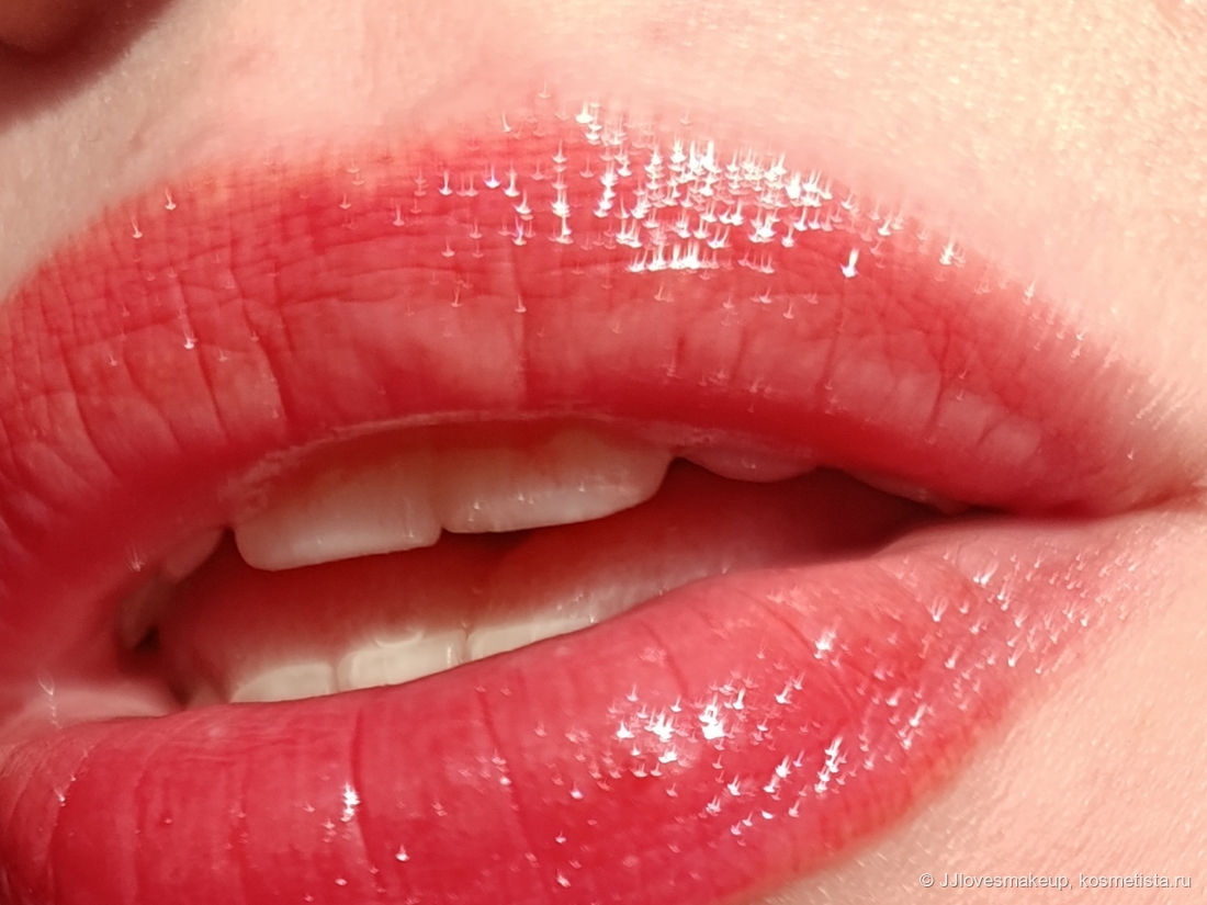 Плотность/прозрачность: полупрозрачный, немного тонирует губы, блёстки тоже видно не только во флаконе, но и на губах.