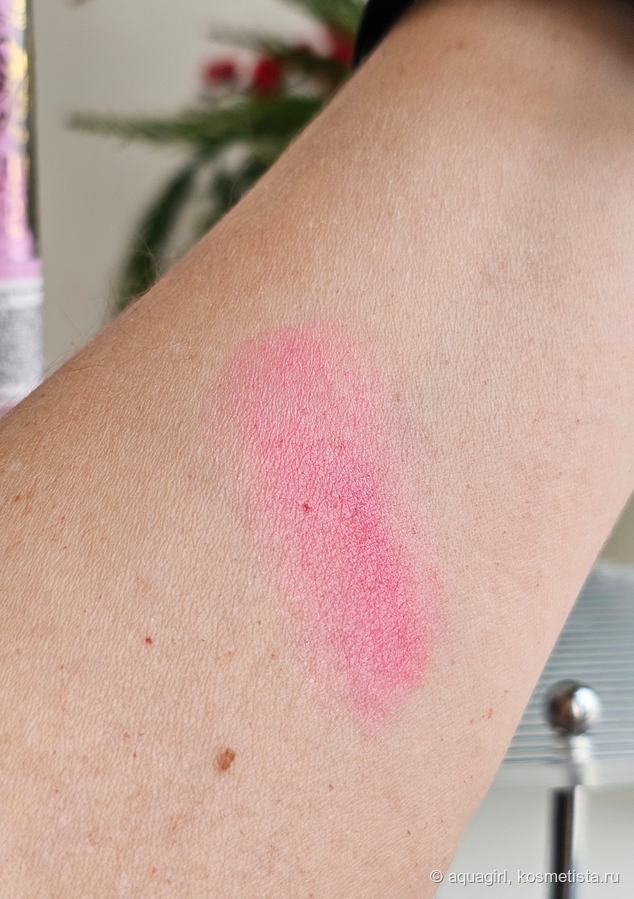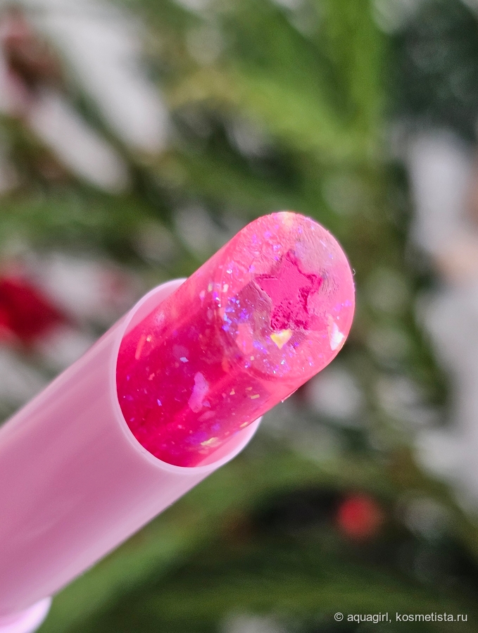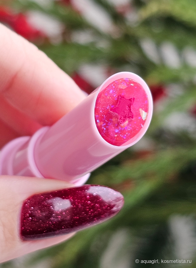 Тинт состоит из двух текстур. Первая — это база с крупным глиттером, который на губах не остаётся и выполняет исключительно декоративную функцию. Вторая — это кремовая середина в виде звезды, она более пигментированная и придаёт губам розовый оттенок.