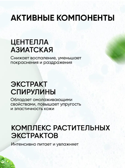 Активные компоненты такие как центелла азиатская снижают покраснение, экстракт спирулины омолаживает, а растительные экстракты питают и увлажняют. Полная информация о действующих веществах указана в составе продукта.