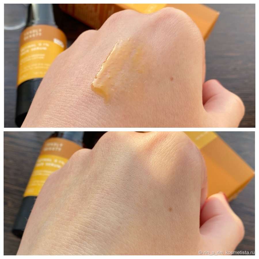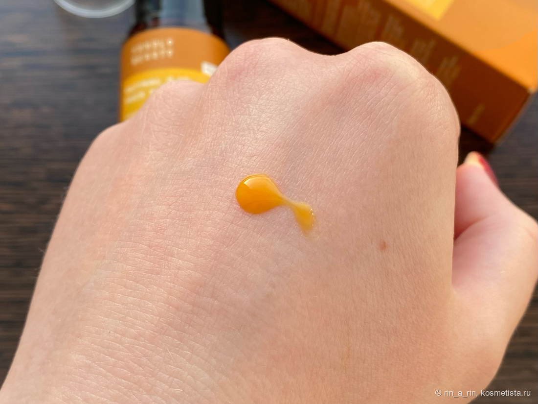 Текстура у сыворотки жидкая, а консистенция интересная — нечто среднее между водой, гелем и маслом. При этом впитывается в кожу моментально, не оставляя после себя липкости и жирности. Сразу после нанесения придаёт коже лёгкий морковный оттенок.