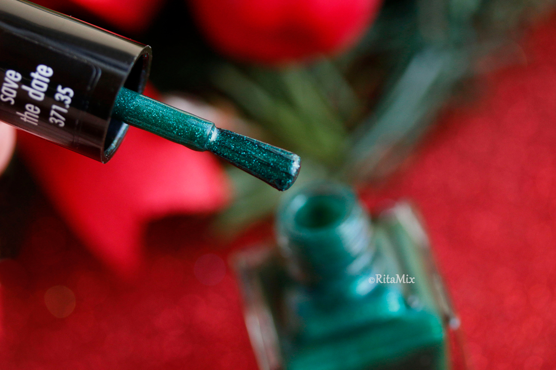 По текстуре этот лак шиммерный. Цвет — темно-зеленый. Не правда ли, логичный выбор для новогднего маникюра?