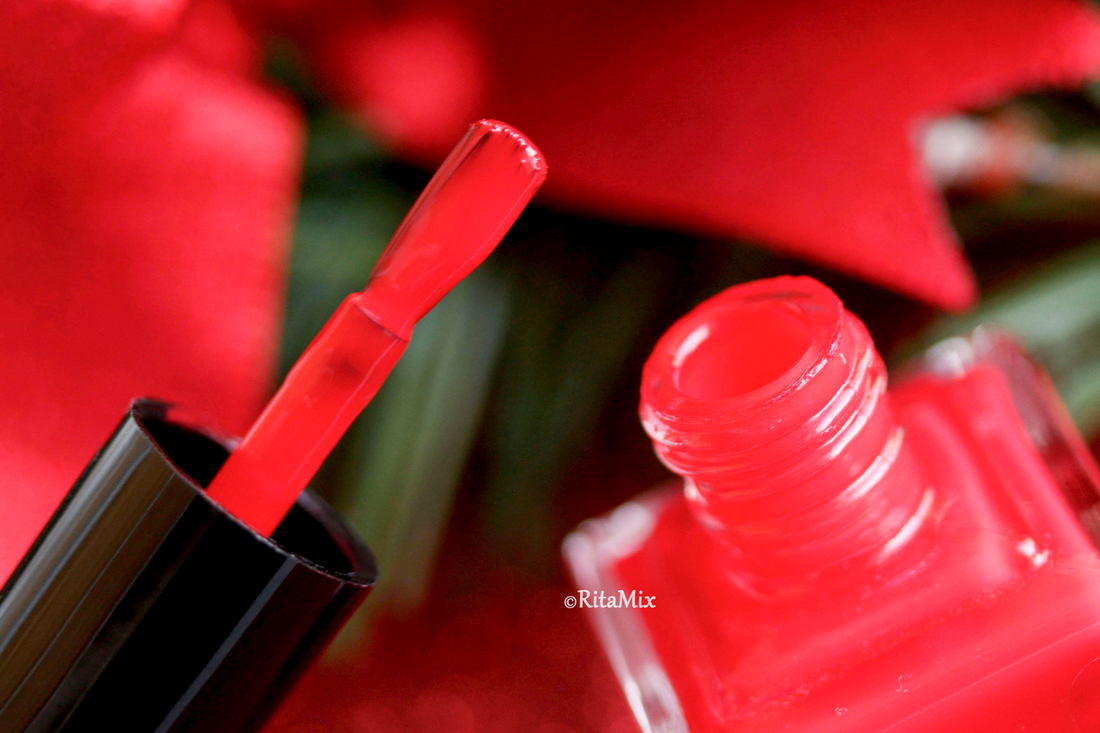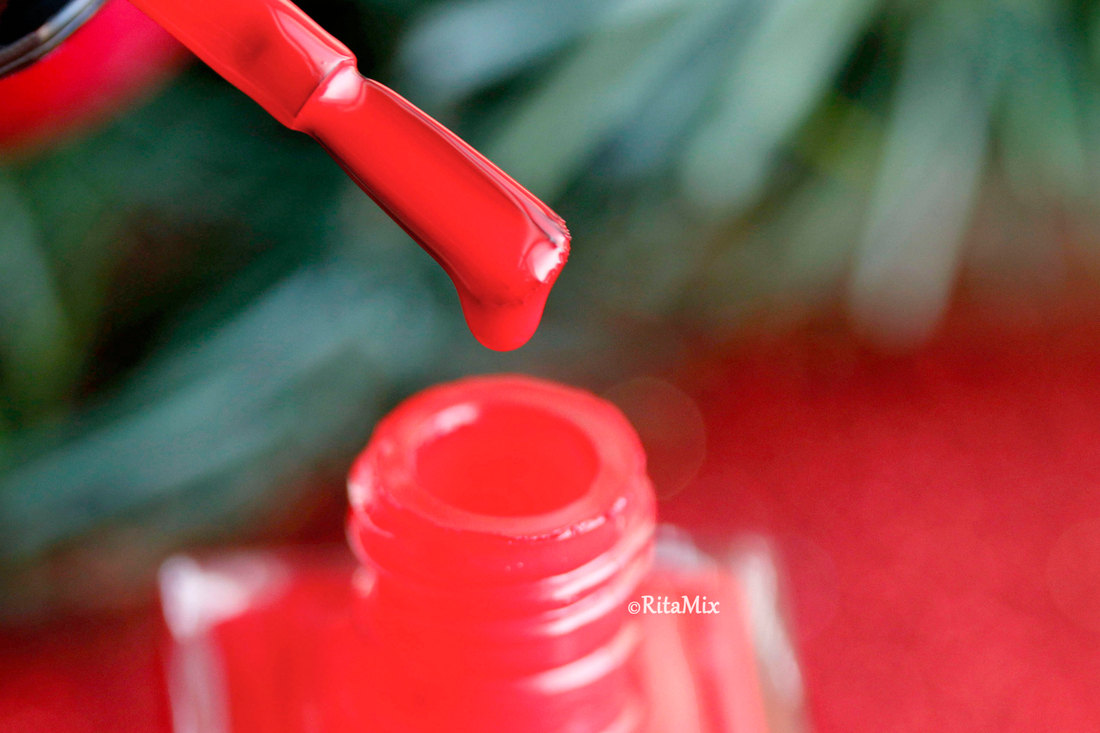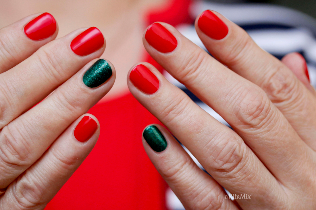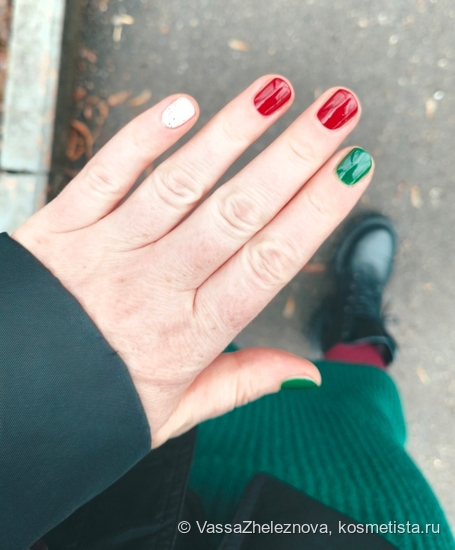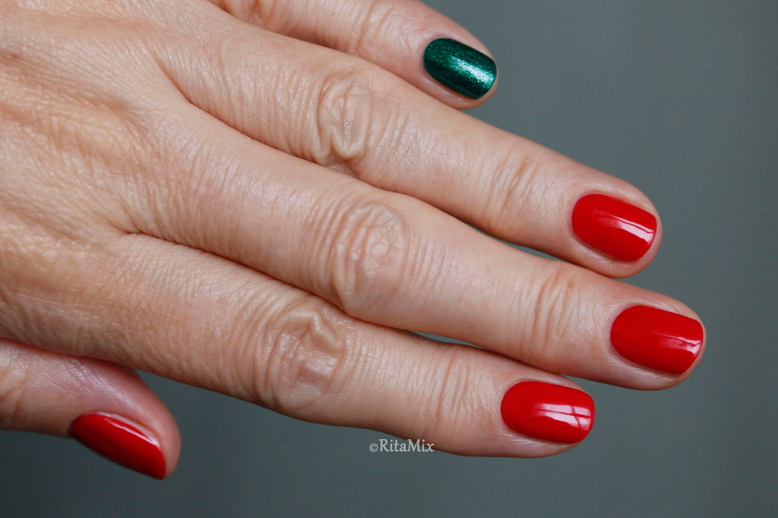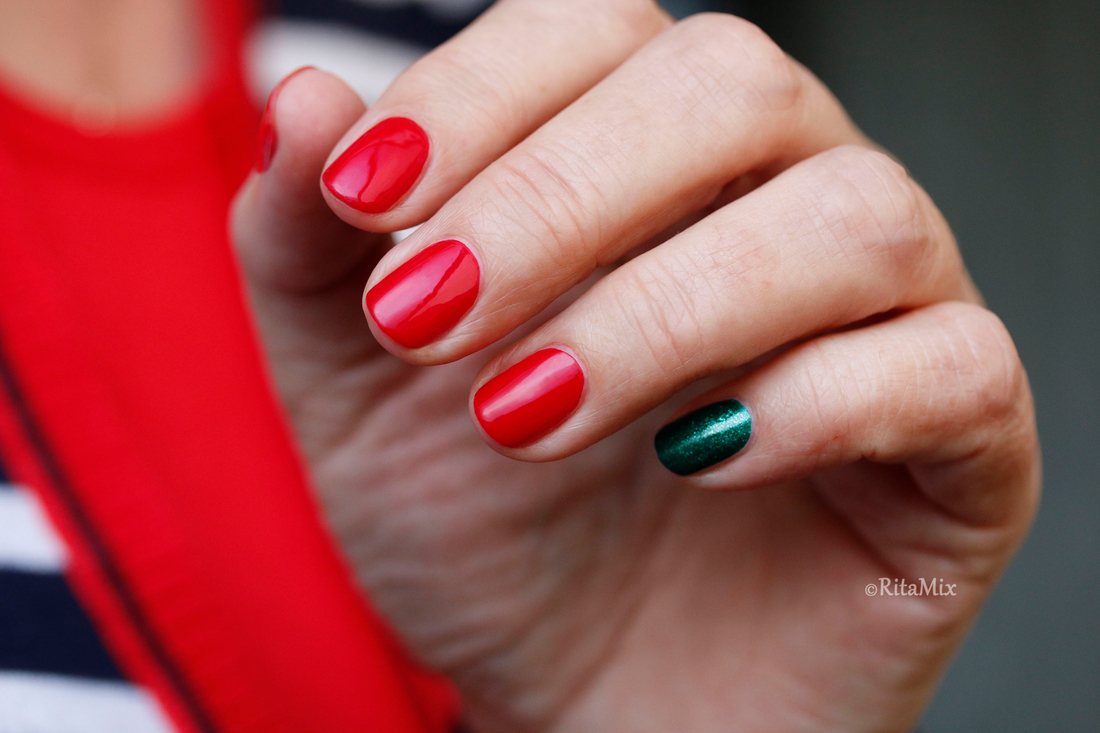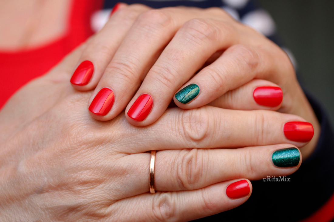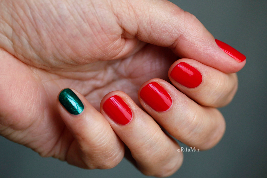 В этом году задумала, что мой новогодний маникюр будет классическим, поэтому для встречи года Огненной Лошади я выбрала красный лак, который отлично подходит моим коротким ногтям, но в последний момент вдруг засомневалась, уж очень маникюр получался строгим, даже больше деловым, чем праздничным, поэтому решила разбавить красный, добавив зеленый акцент.