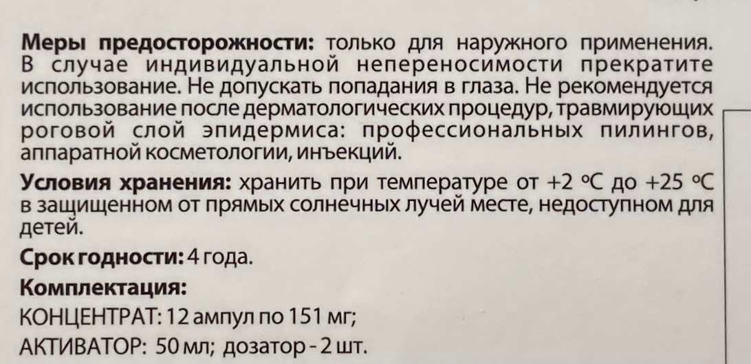 Перед использованием вскрываем ампулу, добавляем внутрь активатор до указанной отметки. Надеваем дозатор, и оставляем на пуру минут, чтобы сухая фаза полностью растворилась.