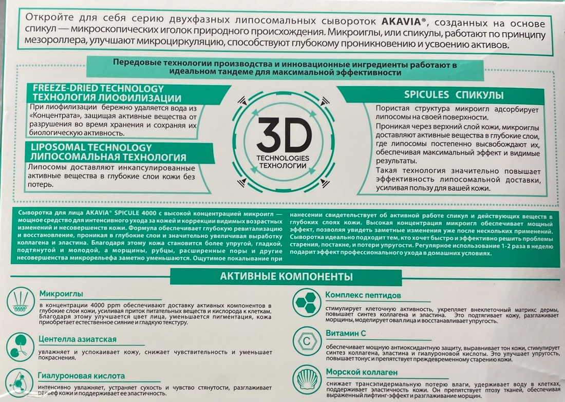 Сыворотка с микроиглами Spicule 4000 Akavia — это интенсивное антивозрастное средство для обновления кожи, улучшения её текстуры и борьбы с возрастными изменениями. Спикулы — это микроскопические иголочки природного происхождения, которые создают микроканалы в коже, благодаря чему активные компоненты проникают поглубже в кожу, повышая их эффективность и запуская процессы обновления и омоложения кожи. При этом все активные ингредиенты в липосомальной форме, а это помогает преодолеть роговой слой кожи и доставить ингредиенты туда, где они будут работать эффективнее, при этом защищены от окисления и разрушения во внешней среде и при нанесении на кожу.