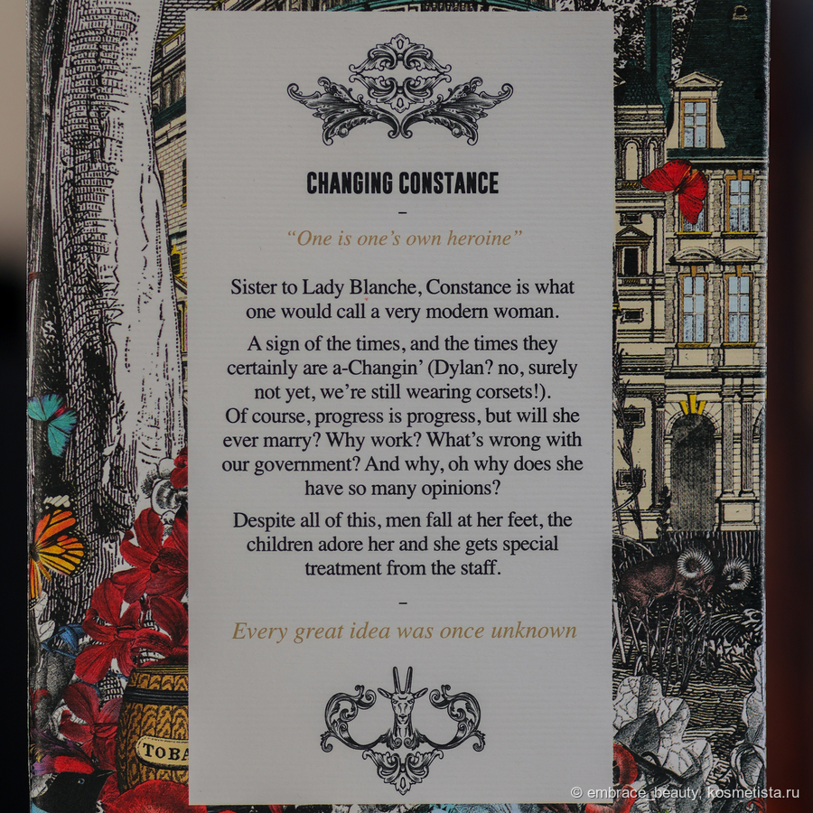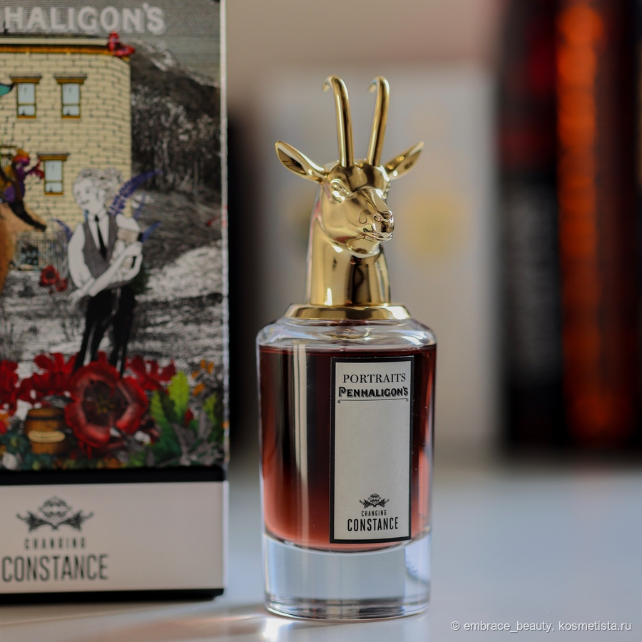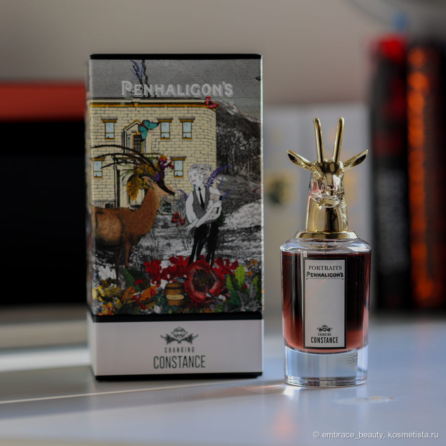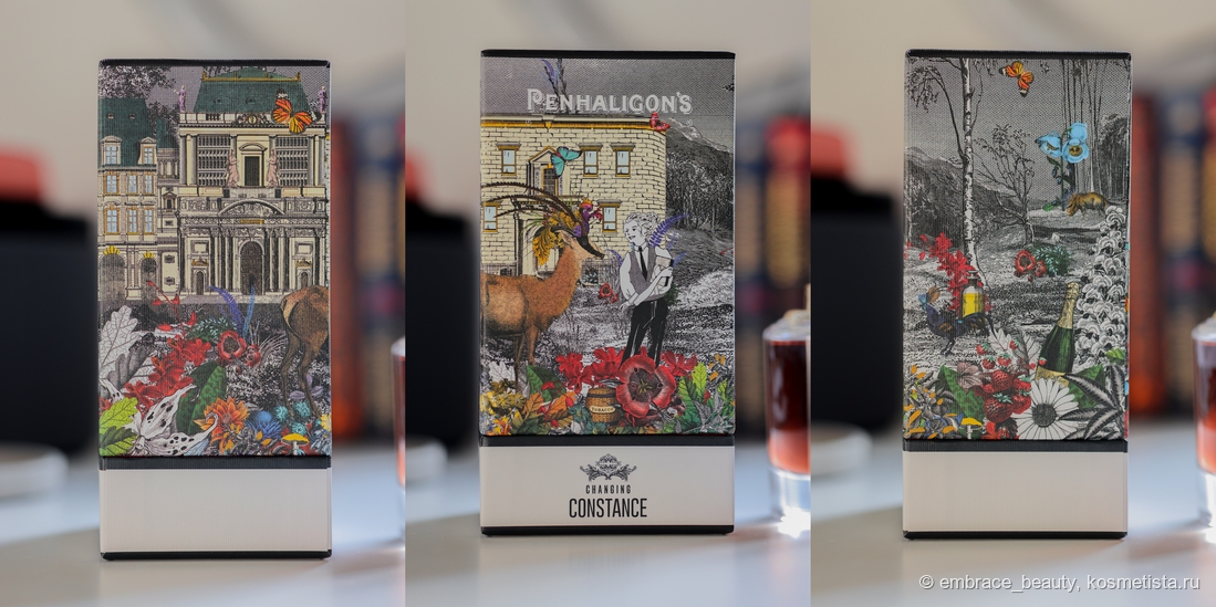 У линейки портретов уникальные и наиболее интересные коробки от парфюмов, которые я когда либо видела. Честно? Минимализм уже надоел, переработанная бумага, пластик и прочее «новомодное» не вызывает вообще никаких эмоций, а линейка портретов прям порадовала! На коробке буквально разворачивается история, настроение аромата, нарисованы даже его составляющие и две главные героини — Констанс, о которой пойдет речь, и Антилопа, образ которой взяли для создания шикарнейшей крышки парфюма.