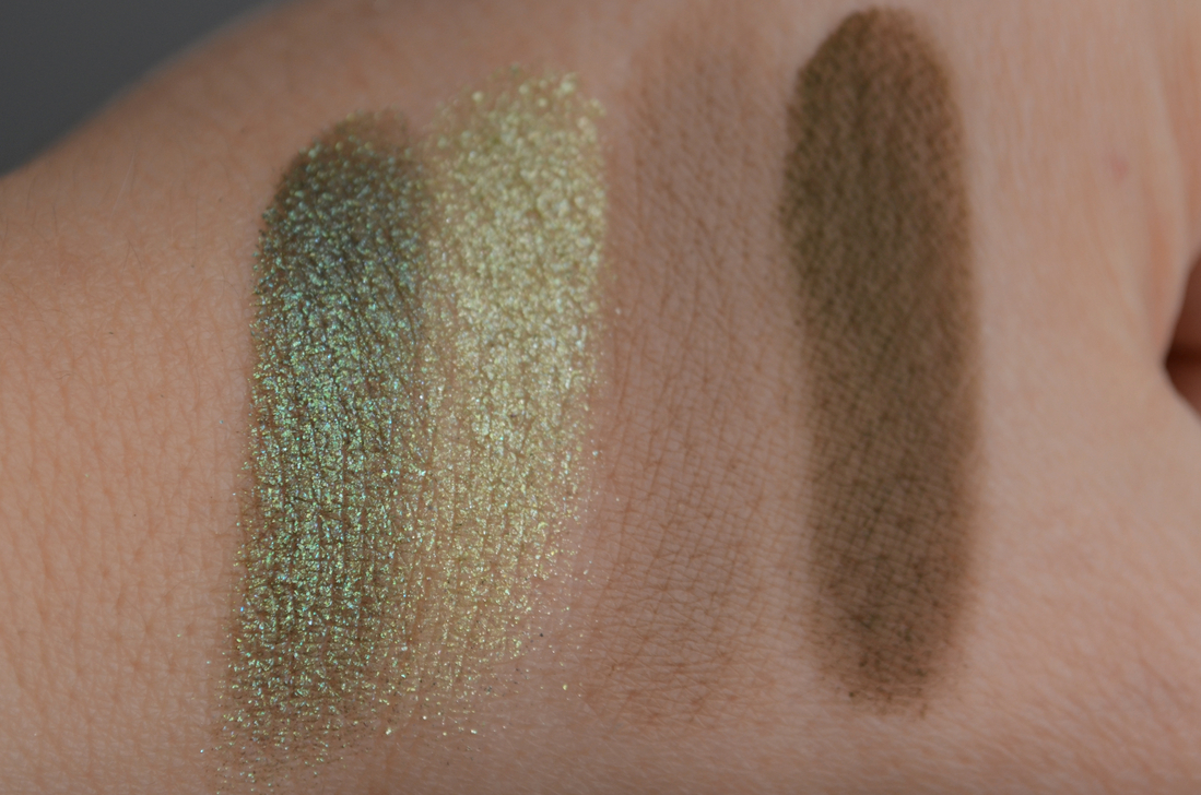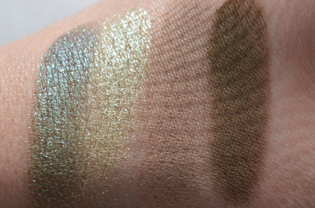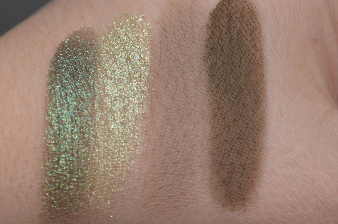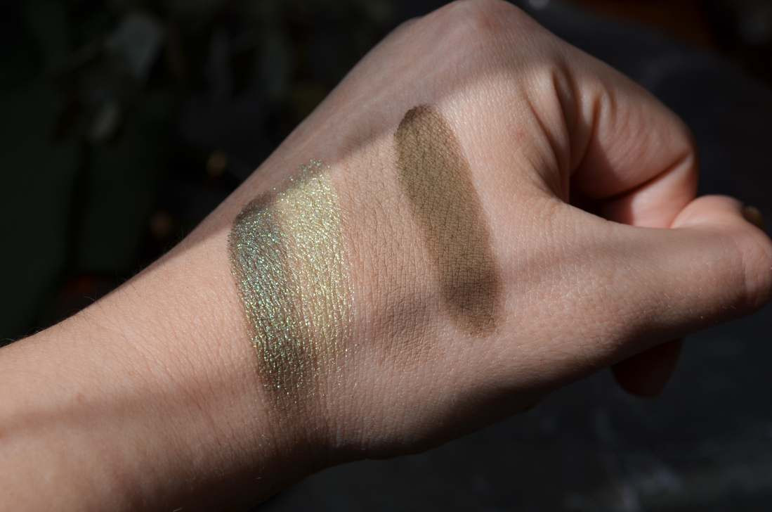 Сияшка потемнее пытается в дуохромность, у неё сероватая база и фиолетовое преломление, но видно это только на свотчах, на веках — увы, нет.