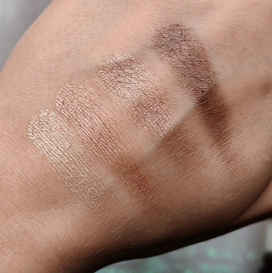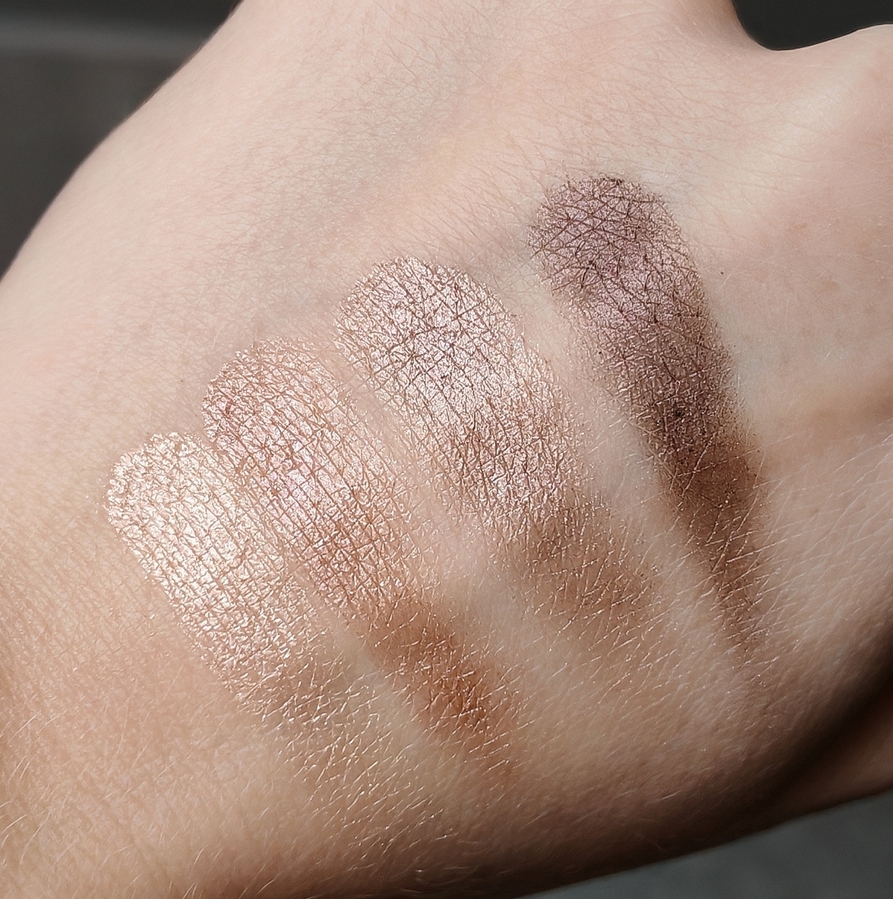 В палетке 4 сатиновых сияющих оттенка от светлого к тёмному. Оттенки нюдовые, нейтральные, спокойные.