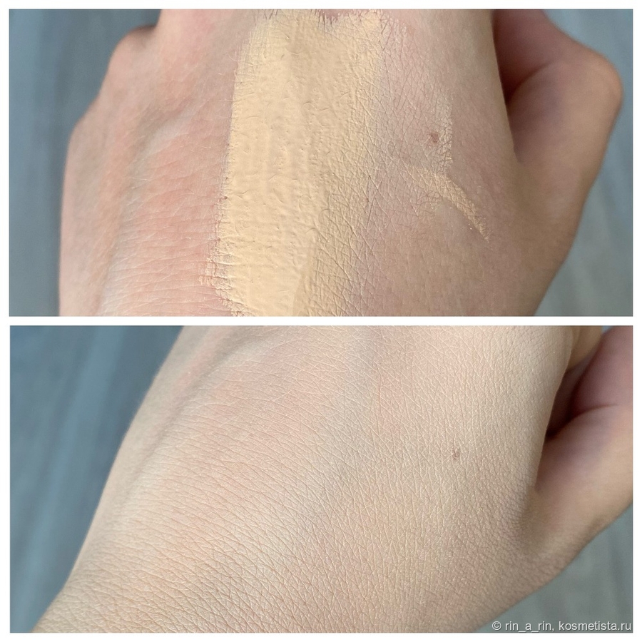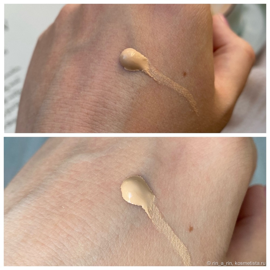 Консистенция у крема однородная, по рекомендации производителя перед нанесением я дополнительно встряхиваю флакон. Текстура густая, муссовая, каплю держит и не растекается. На ощупь тональное средство силиконистое, бархатистое.
