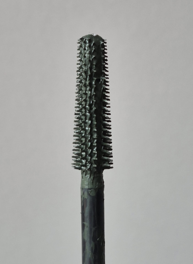 Щёточка стандартная для этой линейки — силиконовая, мягкая и гибкая. Вот именно гибкость смутила меня в первый раз пять лет назад — стоит нажать посильнее, как щетка изгибается и мощно шмякает наносит тушь от корней по всей длине. Особенно свежеоткрытая. Но после пары раз привыкаешь и уже наносишь её едва касаясь, благо текстура позволяет.