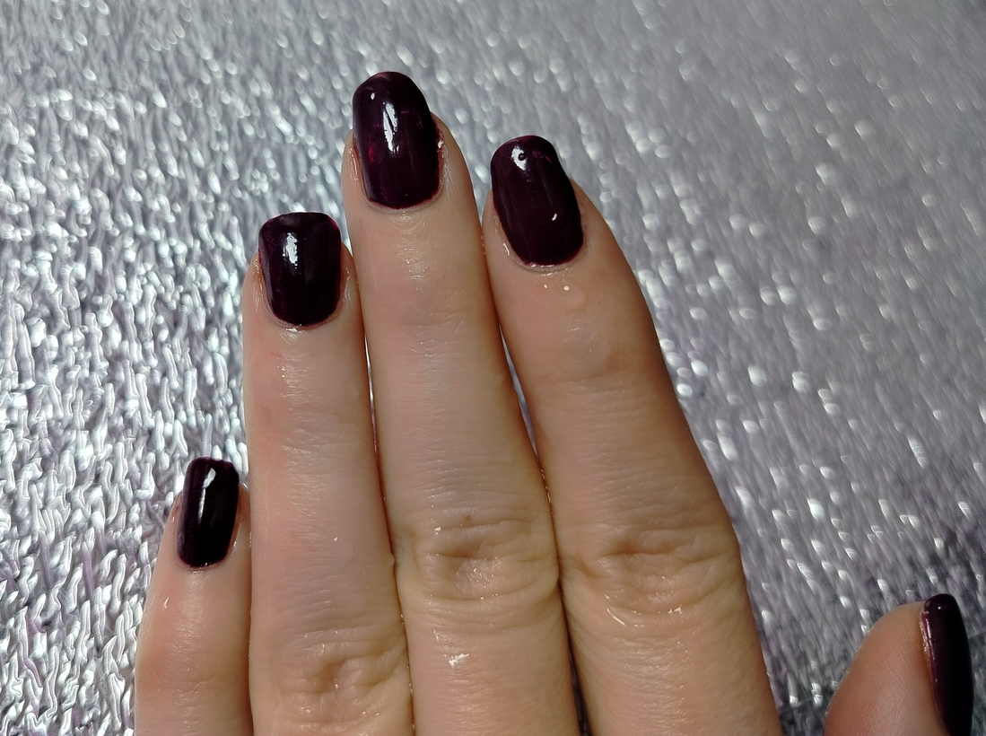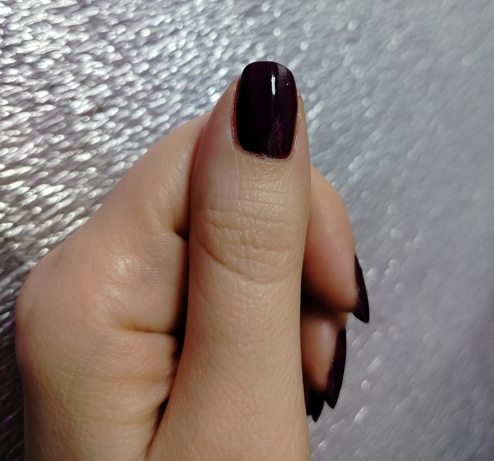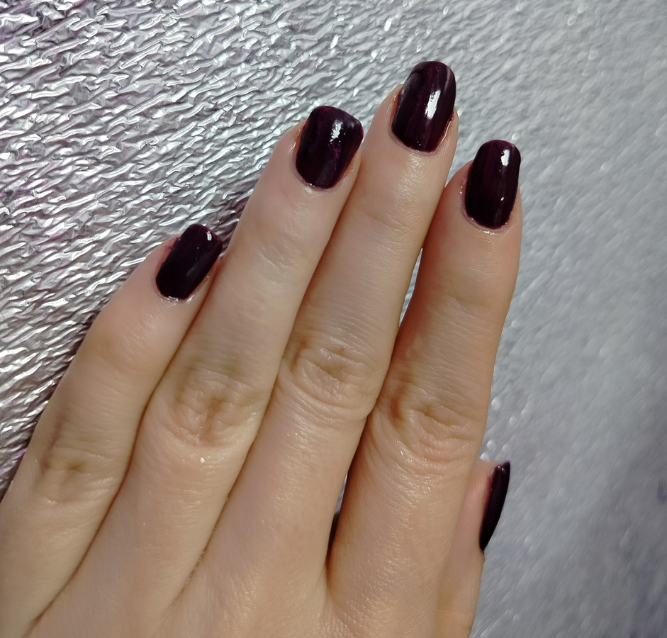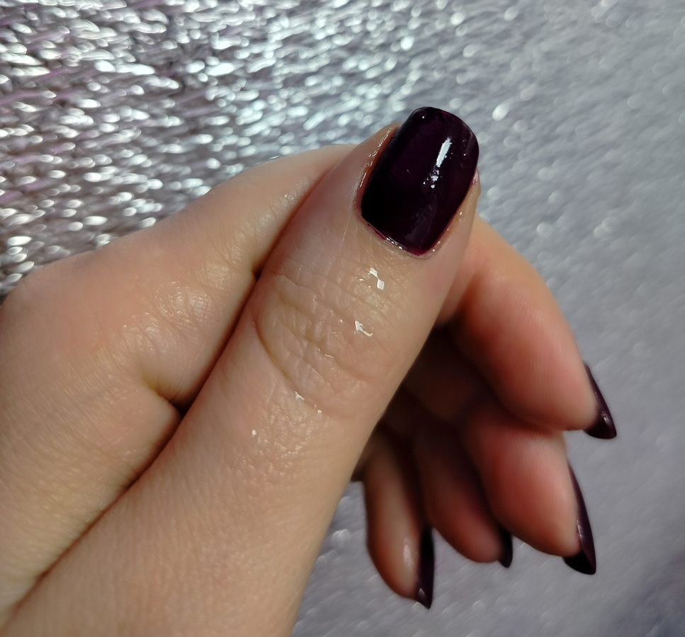 Оттенок Zip Wine — глубокий, насыщенно темно-фиолетовый или ягодно-бордовый. Причем заметно отличается в флаконе и на ногтях (нет, это не игра камеры — лак действительно гораздо более темный при выкрасе).