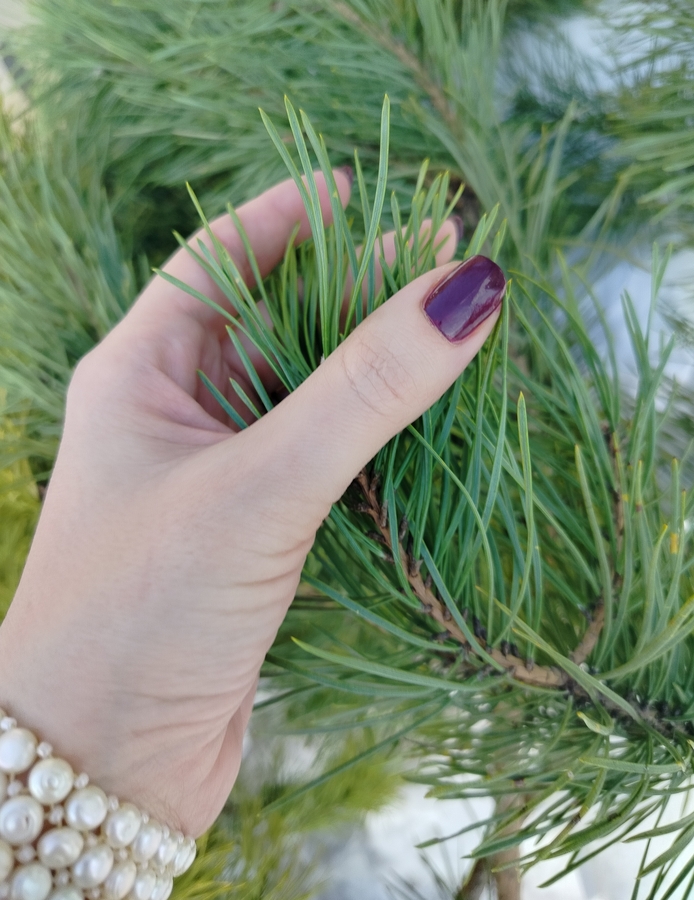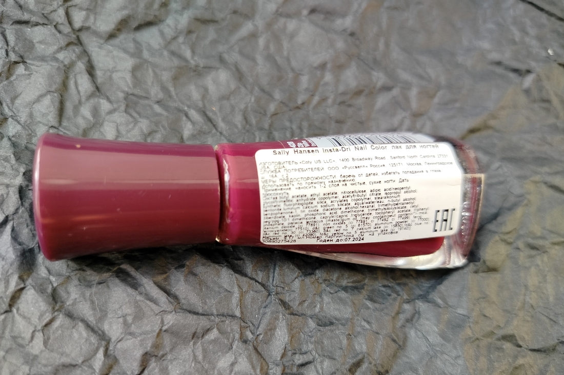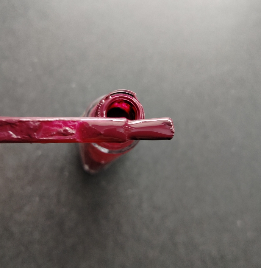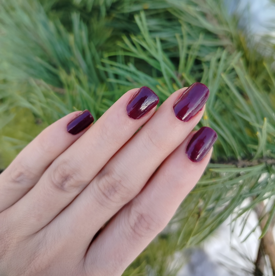 Оттенок Zip Wine — глубокий, насыщенно темно-фиолетовый или ягодно-бордовый. Причем заметно отличается в флаконе и на ногтях (нет, это не игра камеры — лак действительно гораздо более темный при выкрасе).