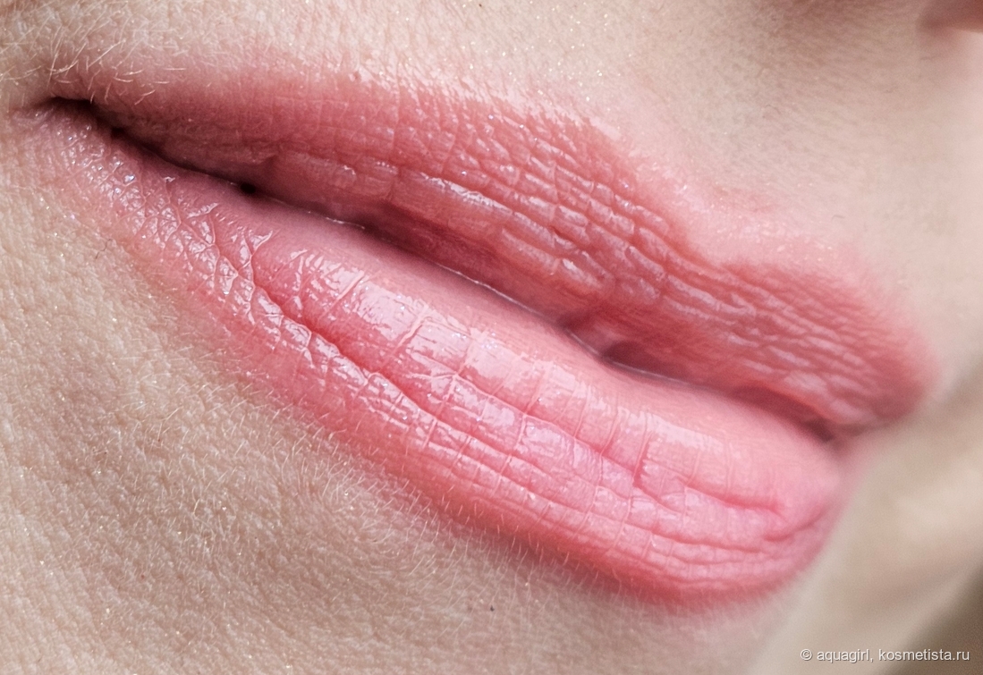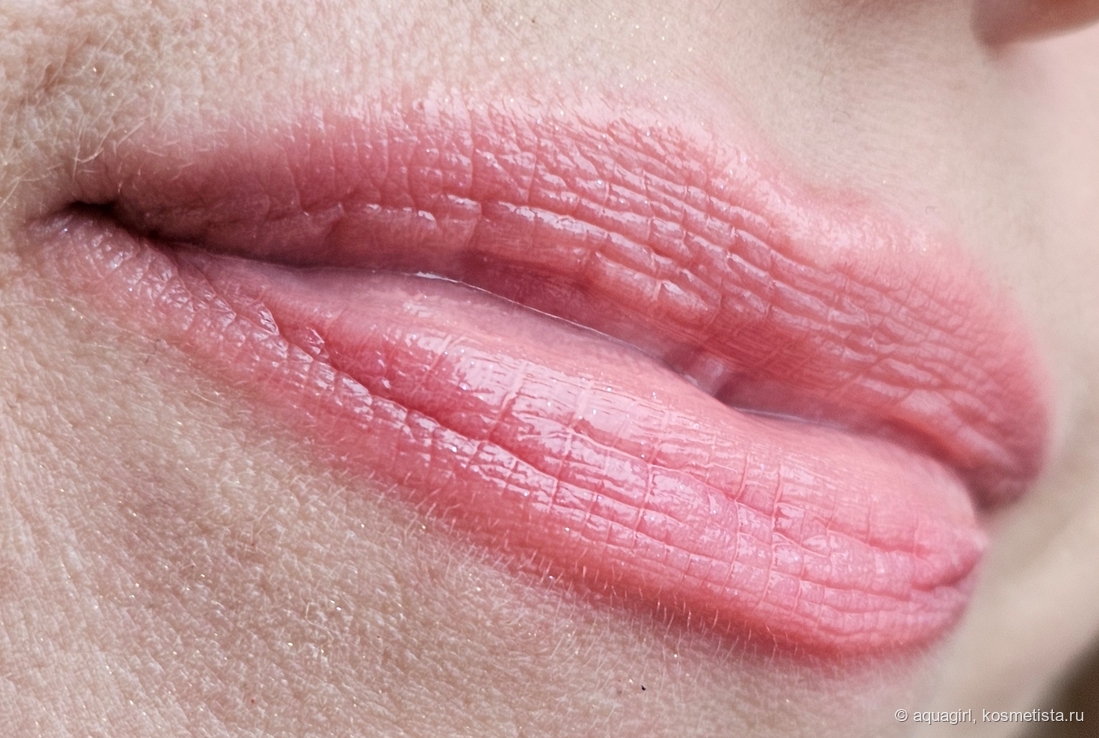 Так как оттенок разбеленный, есть небольшие затекания в складки. Я не встречала пока ни одного средства для губ такого оттенка, которое бы так не делало.