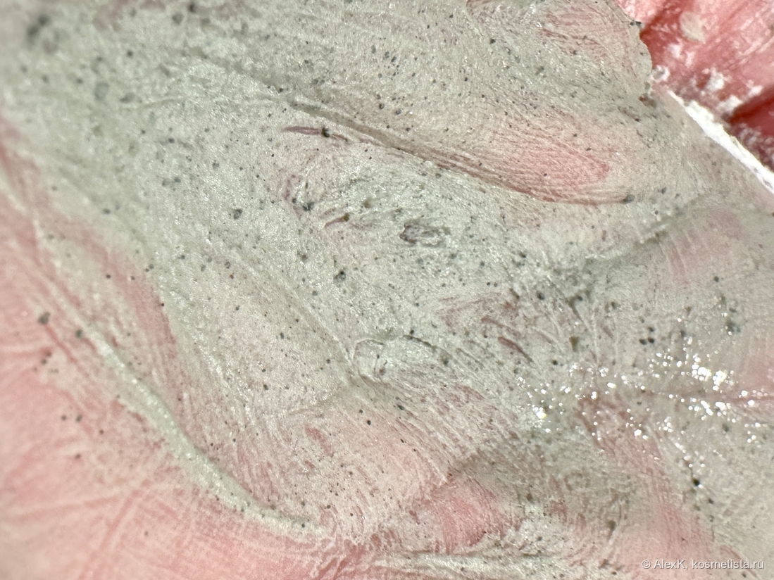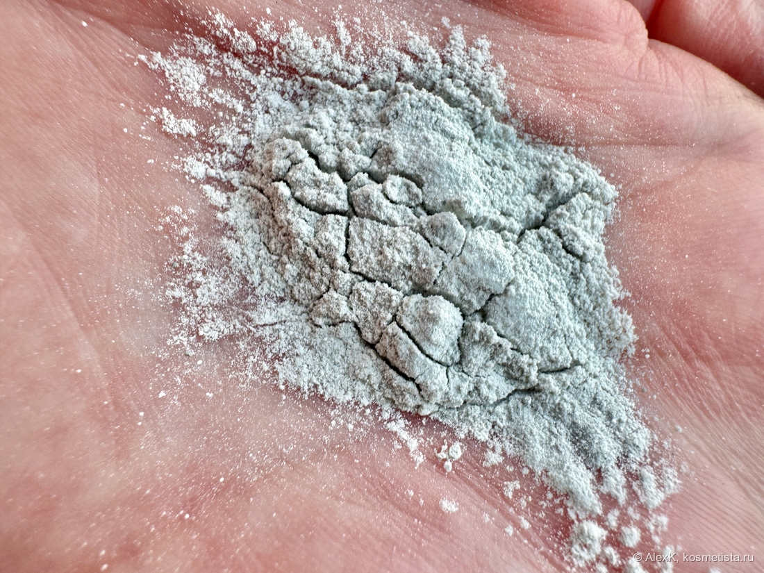 Текстура. Светлая серо-зелёная пудра с вкраплением тёмных частичек. Темнеет при намокании. Пенится слабо. Распределяется мягко, не царапает и не раздражает.