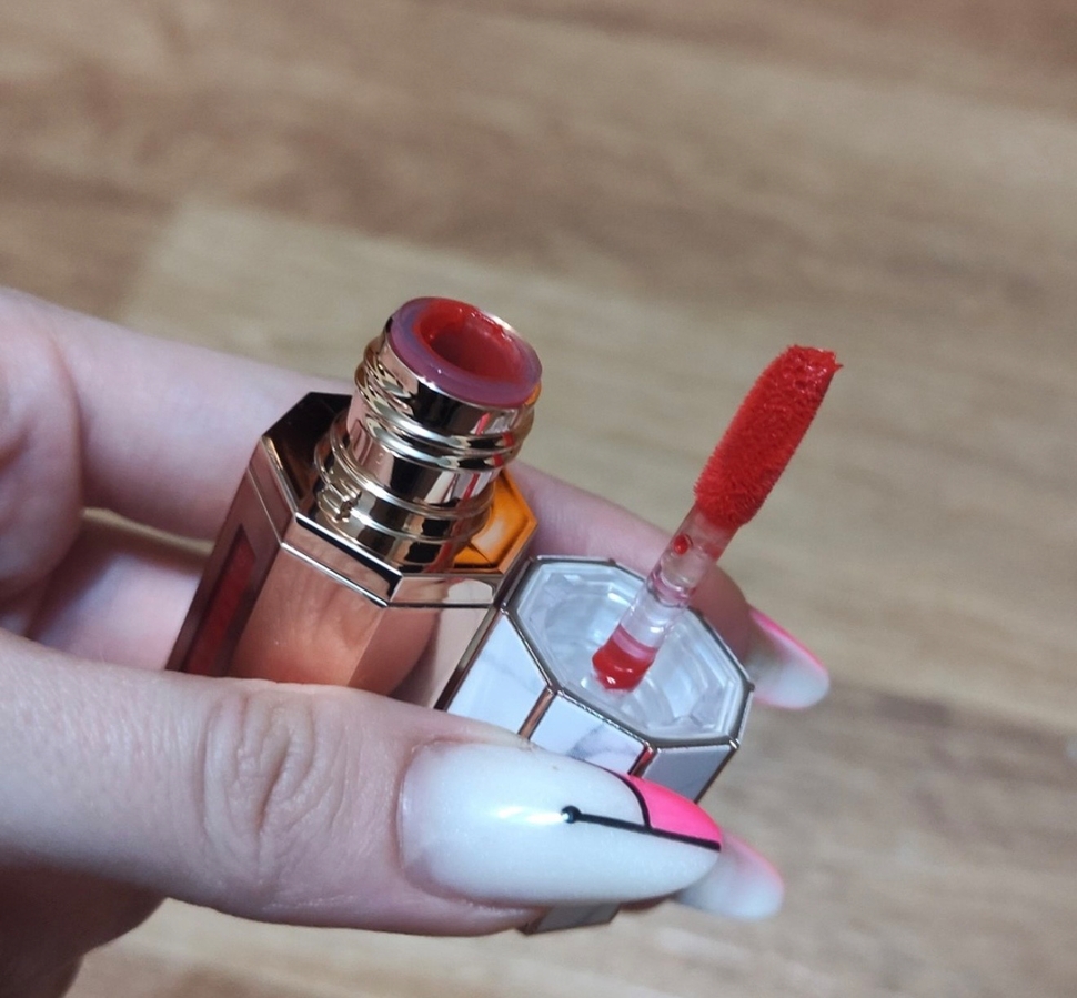 Оформление самой помады тоже до безумия эстетичное. Всё та же «мраморная» крышечка и золото, при чём золото именно по оттенку приятное. Ну и прозрачное окошко, сквозь которое виден оттенок продукта. Не знаю, как там с другими оттенками, но этот красный в сочетании с золотом шарма добавляет однозначно.