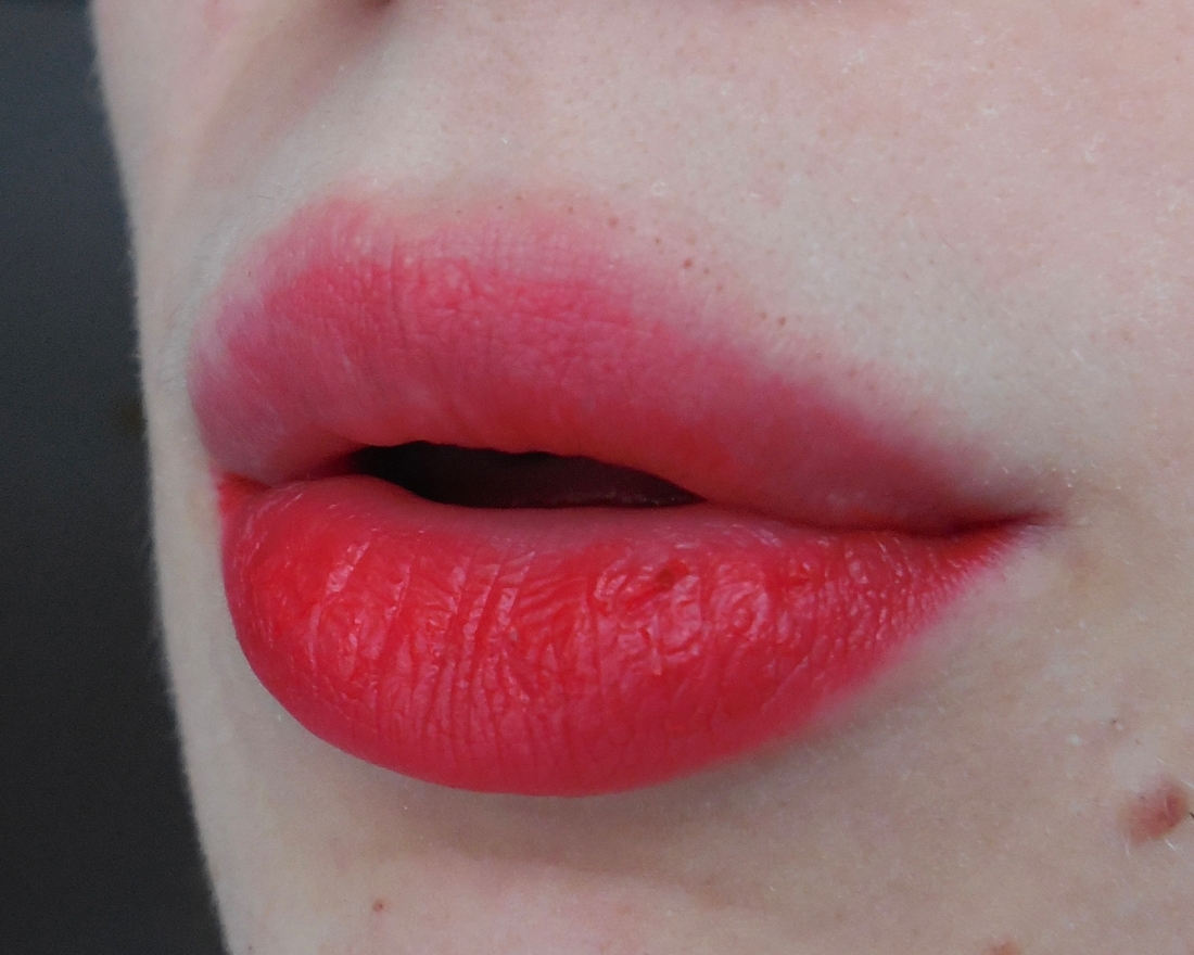 Ограничитель со своей задачей справляется хорошо. Аппликатор здесь скошенный, в меру подвижный. Пользоваться удобно, контур губ рисовать тоже без особых проблем получается, а ведь это, на минуточку, красный оттенок.