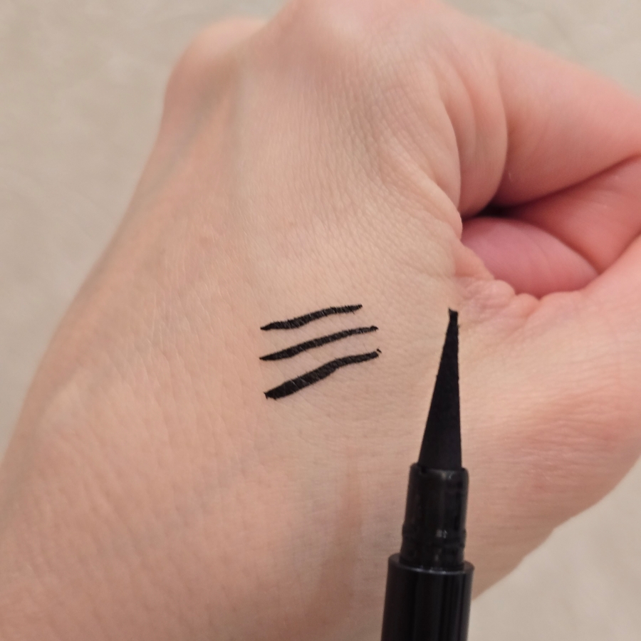 Отличная бюджетная подводка с удобным фетровым аппликатором. Он имеет конусовидную форму, по основной длине он твердый, а вот кончик гибкий. Для меня оказалась идеальной в плане работы, стрелки получаются легко. Пигментация отличная, цвет яркий даже без наслаивания. Стойкость радует, ничего не расплывется и не растекается.