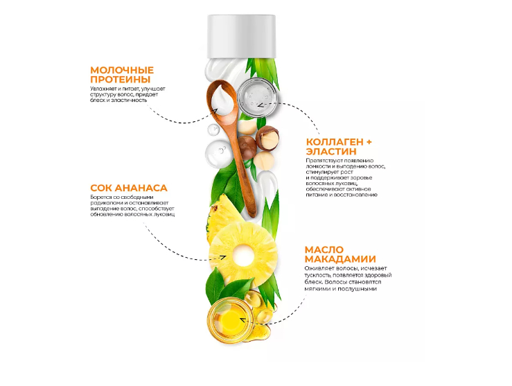 - Коллаген + эластан — препятствует ломкости и впадению волос.