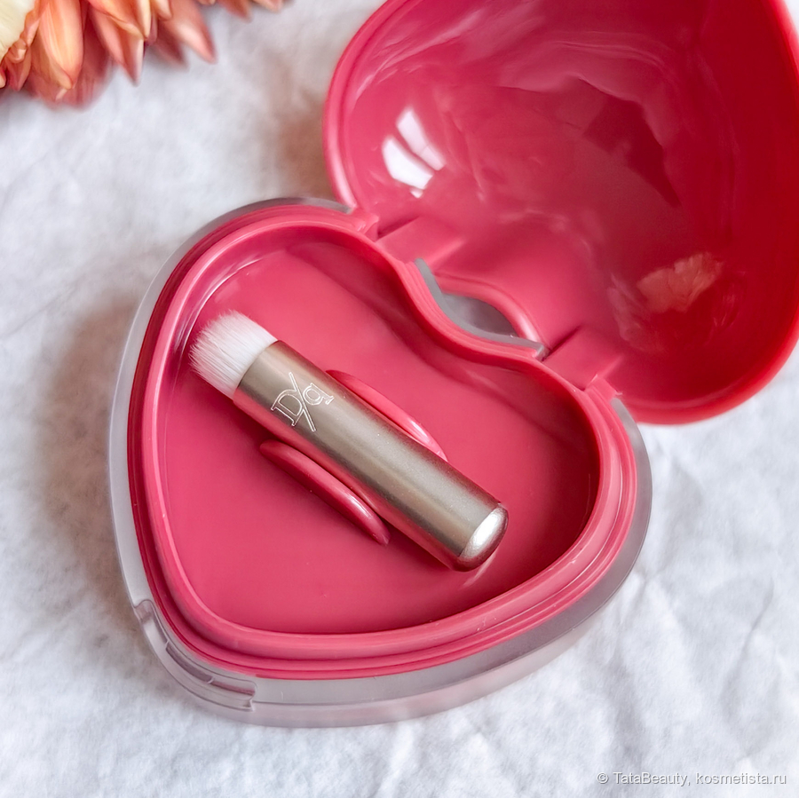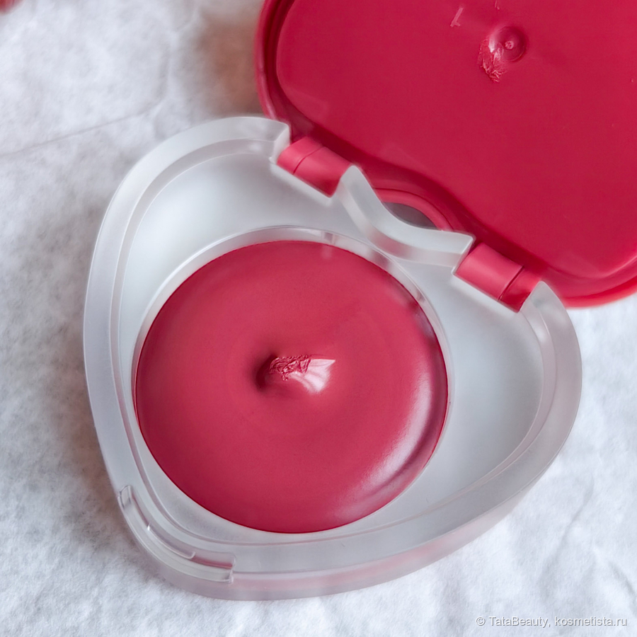 Продукт упакован в милую баночку в форме сердца. Я помню, когда корейская косметика «заходила» на российский рынок, почти все упаковки были как раз такими милыми. Цвет крышечки повторяет цвет самого средства, это удобно, потому что, если купили несколько оттенков, то удобно в них ориентироваться. Под основной крышечкой есть ещё одна, на ней крепится крошечная кисть, которой, кстати, очень удобно наносить суфле на губы. Есть ещё картонная коробка.
