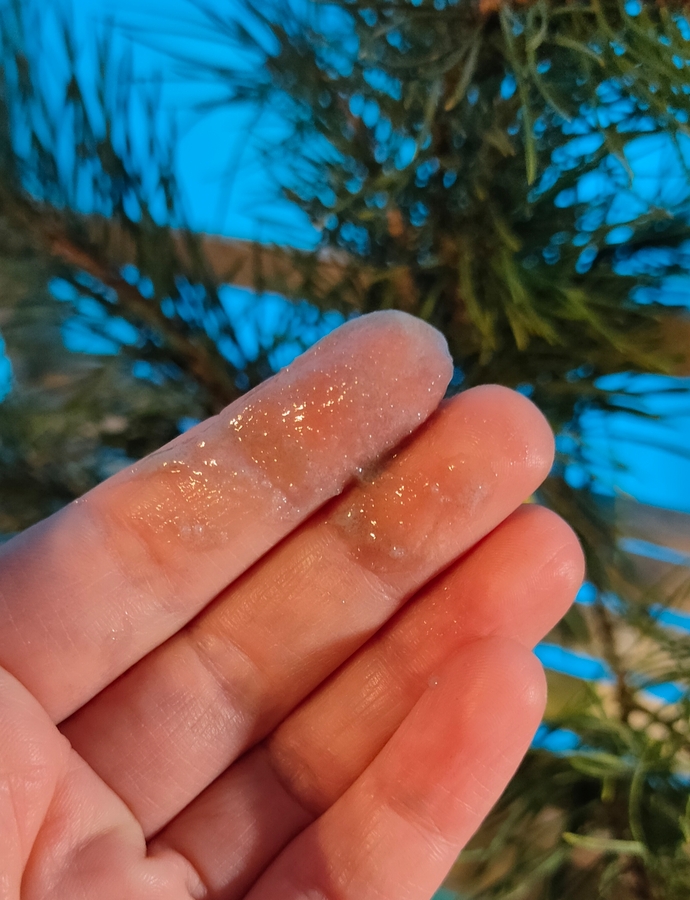 Насколько я поняла, в качестве скрабирующих частичек используется мелкая соль.Частички реально мелкие, их много и они совершенно не травмируют кожу. Текстура пластичная, тянущаяся, как жвачка. Пользоваться конечно приятно. Другое дело, что распределять такое совсем не легко. У меня, правда, особенно и опыта использования скрабов нет, но мне кажется, у него не очень удобная текстура. Он как-то прилипает к волосам и нанести его на кожу головы не так уж и просто.