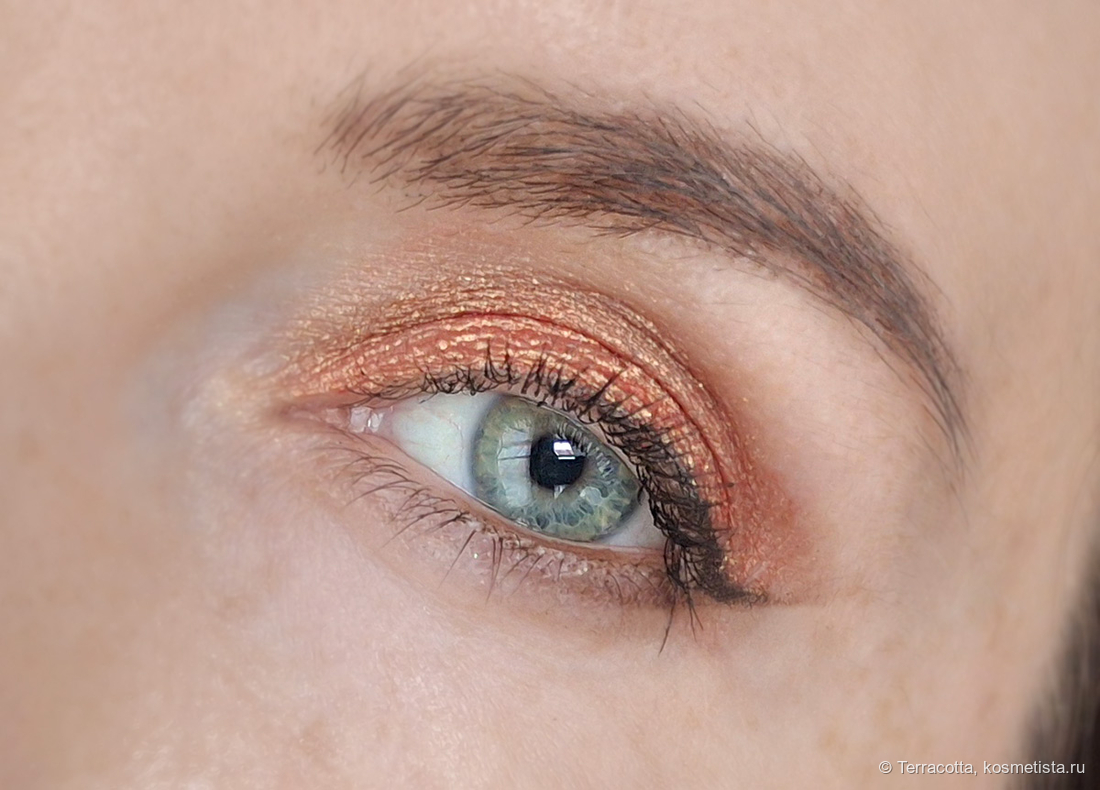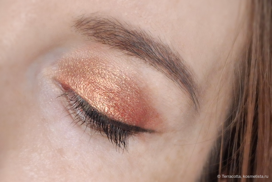 Набираются очень плотным слоем, поэтому уже на свотче я задалась вопросом, как эта яркая и плотная текстура будет выглядеть на веках? Почему-то я ожидала легкое персиковое свечение, корейские продукты редко бывают чрезмерно яркими и пигментированными. И тут такое роскошество.
