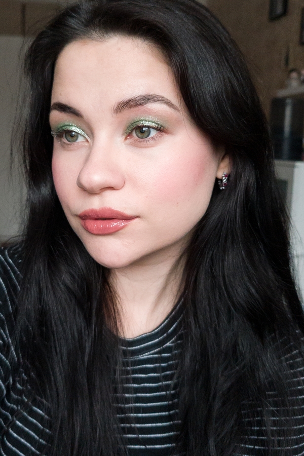 В качестве макияжа я просто нанесла спаркл на голое веко и как могла растушевала его в складке. Вы знаете, если опустить все особенности нанесения, мне даже нравится, как он выглядит, от этого оттенка веет свежестью и прохладой, как от мокрой весенней травы.
