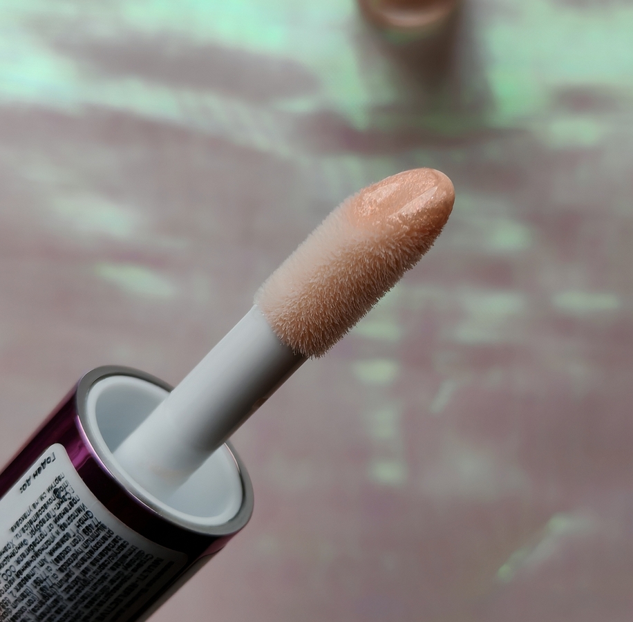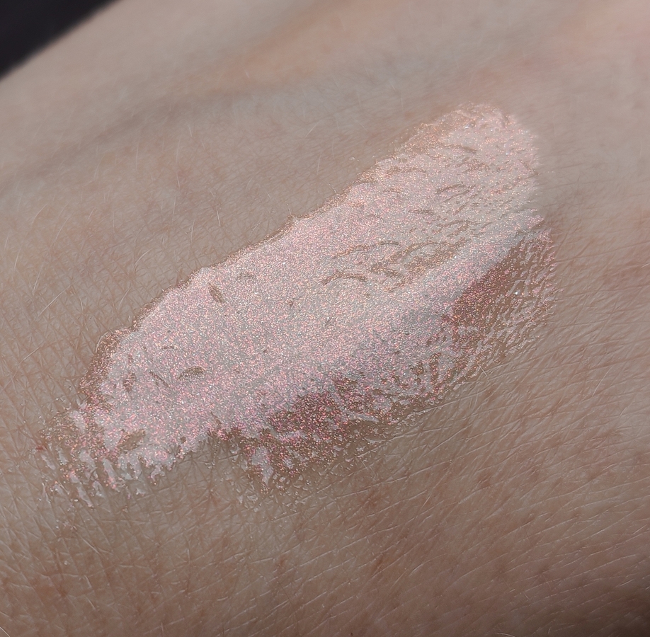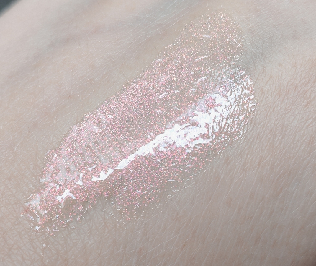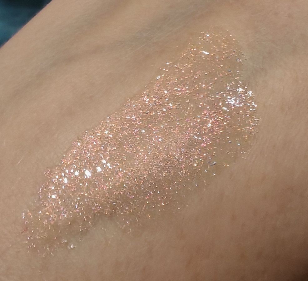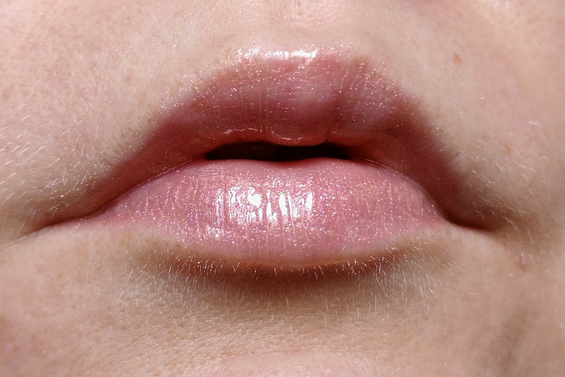 Оттенок очень красивый: россыпь розовых, золотых, персиковых блесток на прозрачной базе. Блесток очень много, они мелкие, на губах не ощущаются.