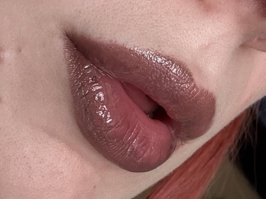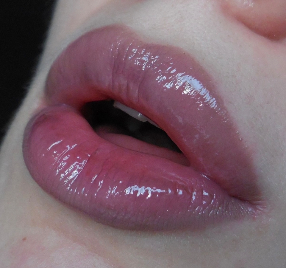 Текстура классическая тающая, продукт скользит по губам и при нанесении превращается едва ли не в блеск. Наносится настолько легко и комфортно, насколько это возможно. По финишу сочный влажный глянец, мне напоминает леденец. При этом к огромным плюсам продукта отношу отсутствие липкости и ещё тот факт, что продукт не собирается на стыке губ.