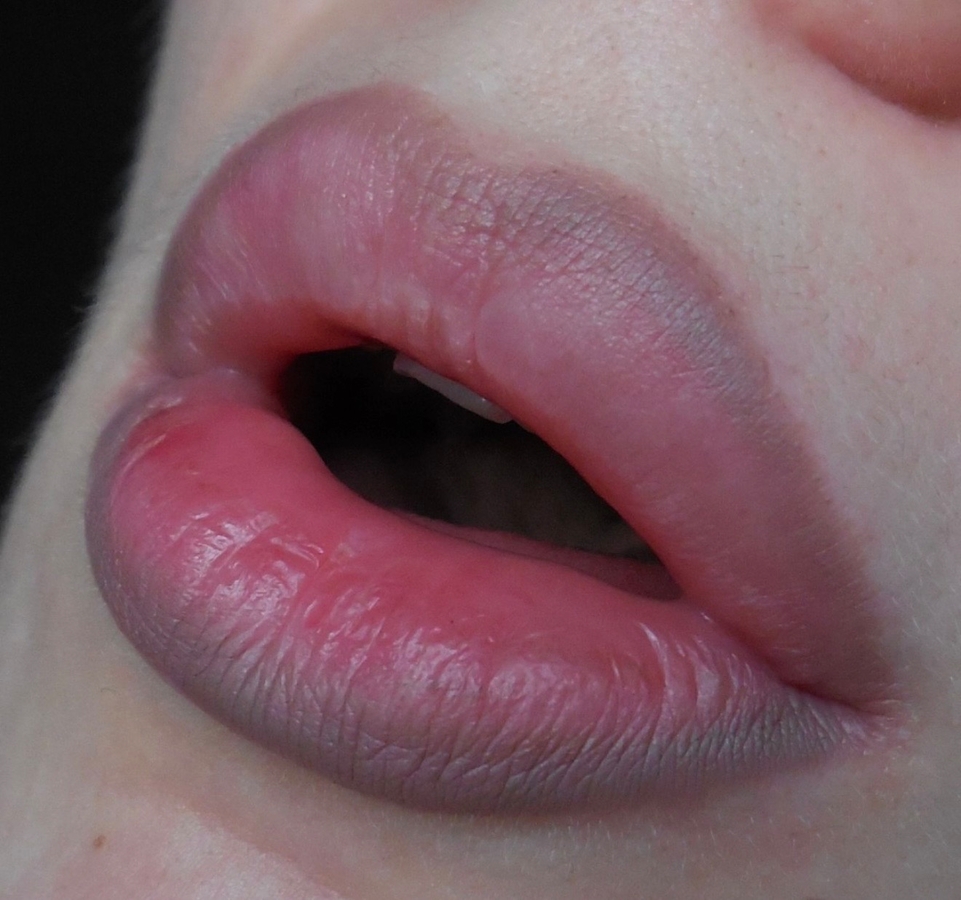 Также продукт вроде как тинтует, ну или должен по крайней мере. Но тинтует он едва-едва. На свотче этого не видно, однако на губах легчайший оттенок остаётся. С моим исходным пигментом губ это тот самый случай, когда получаются «свои губы только лучше». И как же я счастлива, что здесь обошлось без фуксии.