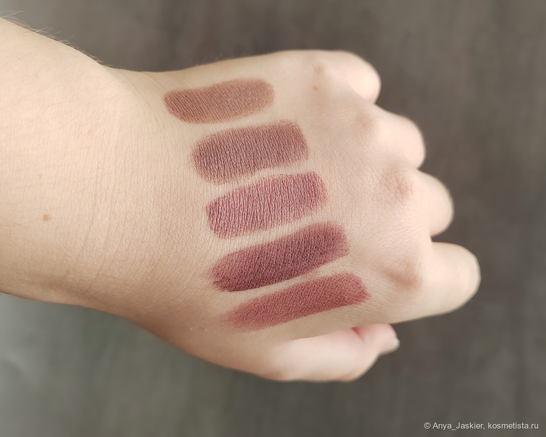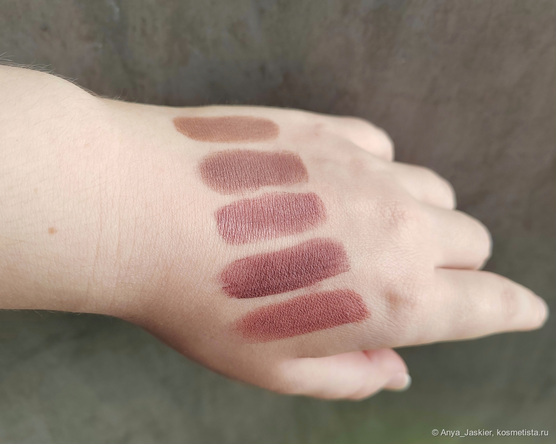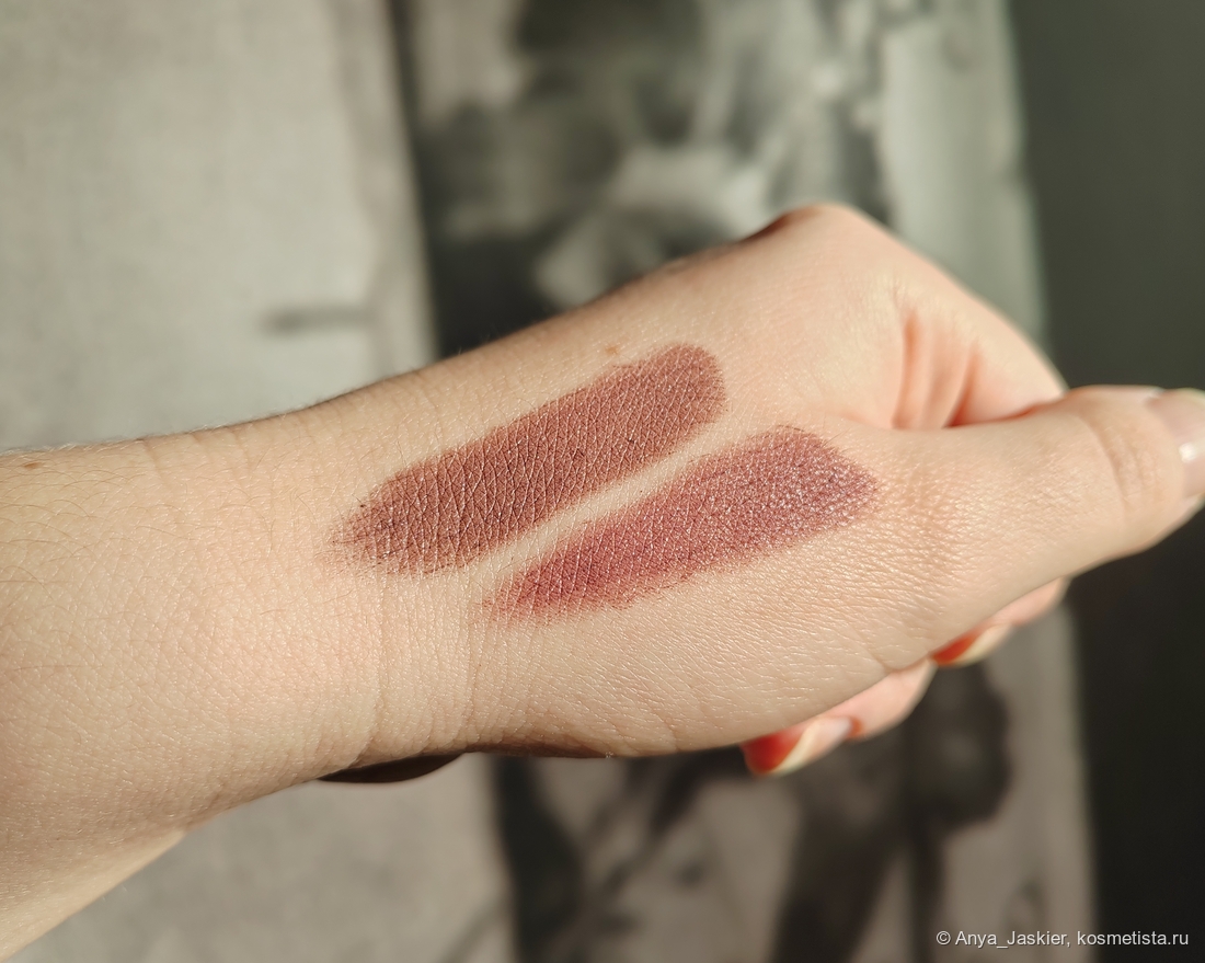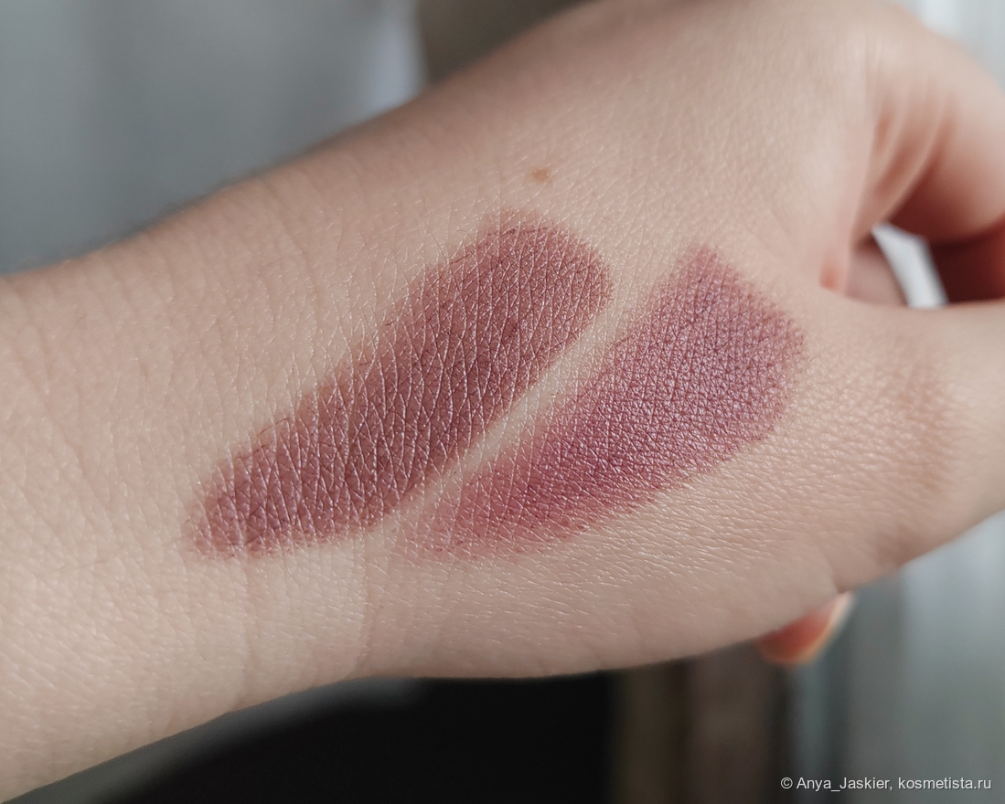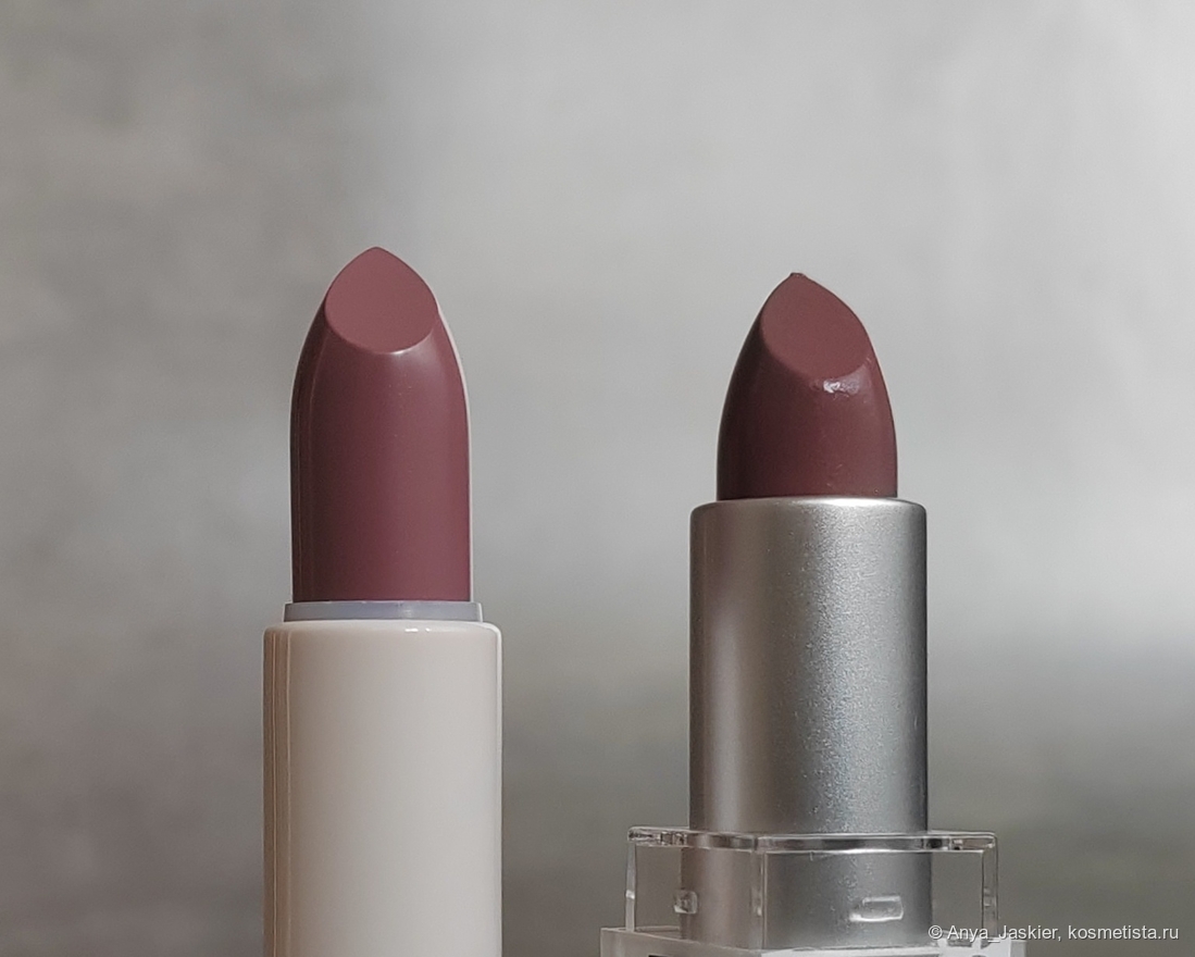 У Технократа и Трендсеттера есть много общего: завод-изготовитель, форма стика, ценовая категория, интересный оттенок. Но есть и отличия, которые незаметны, пока не возьмешь в руки обе помады. Стик Инфлюэнс выглядит более глянцевым, а финиш при этом матовее. Упаковка и там и там пластик, но Стеллари ощущается внушительнее. Цвета кажутся идентичными, но разница всё же есть — ниже я приложила сравнительные свотчи помад друг с другом и похожими оттенками, которые у меня есть. Лично я не могу сделать выбор в пользу какой-то одной из них — обе хороши по своему, обе я использую с удовольствием, и теперь я точно знаю, на какие бренды обращу внимание в первую очередь, когда вновь столкнусь с непреодолимым желанием обновить коллекцию кремовых помад.