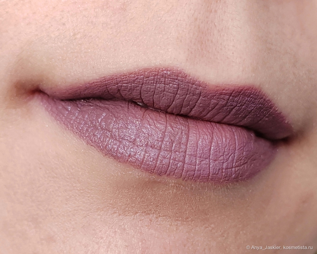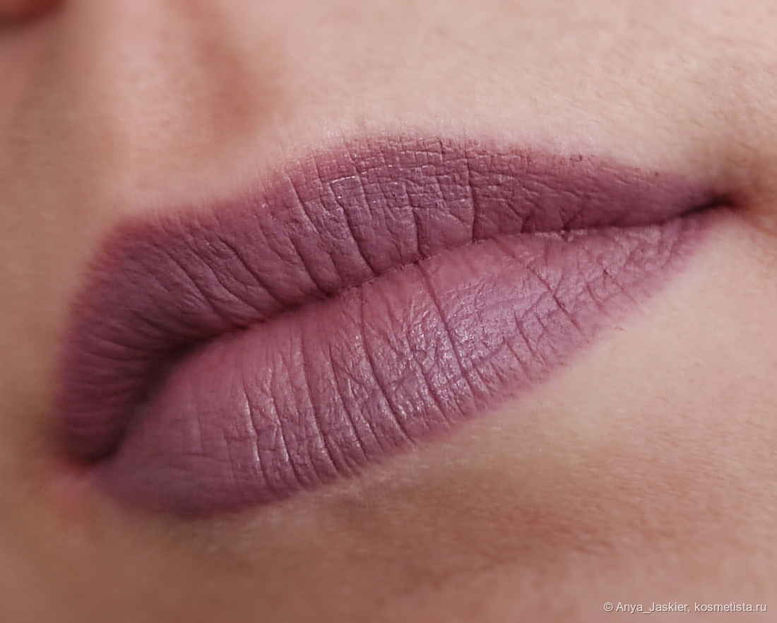 Ощущения от помады комфортные, она не скатывается и не растекается за контур. Мягкая текстура сильнее цепляется за сухие участки на контуре губ, но неровности контура заметны только при близком рассмотрении. Ухода я опять же не ощущаю, но помада не сушит. Покрытие держится 3-4 часа или до первого перекуса, после чего требует обновления или демакияжа (и то и другое можно провести без проблем). Пигмент в складочки не забивается, тинт не оставляет.