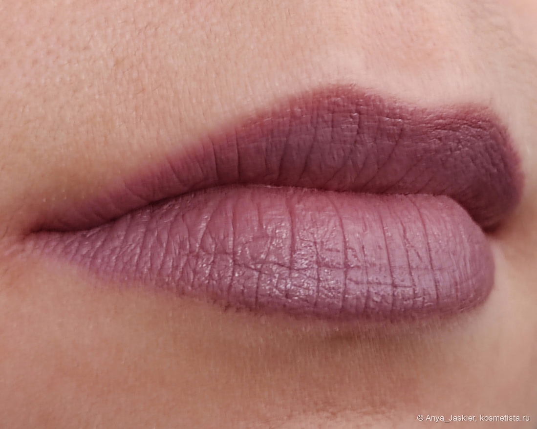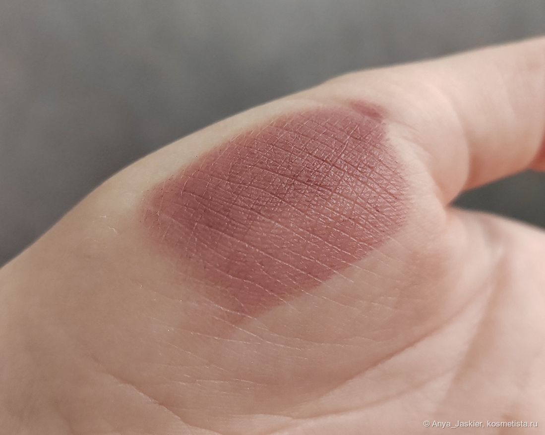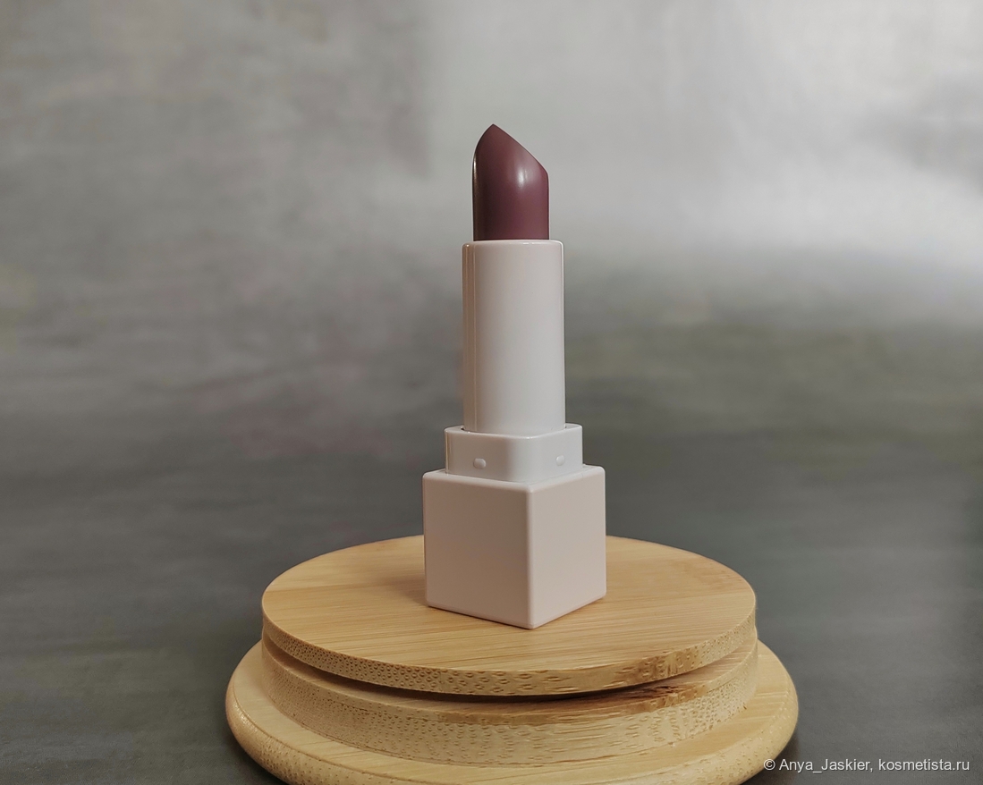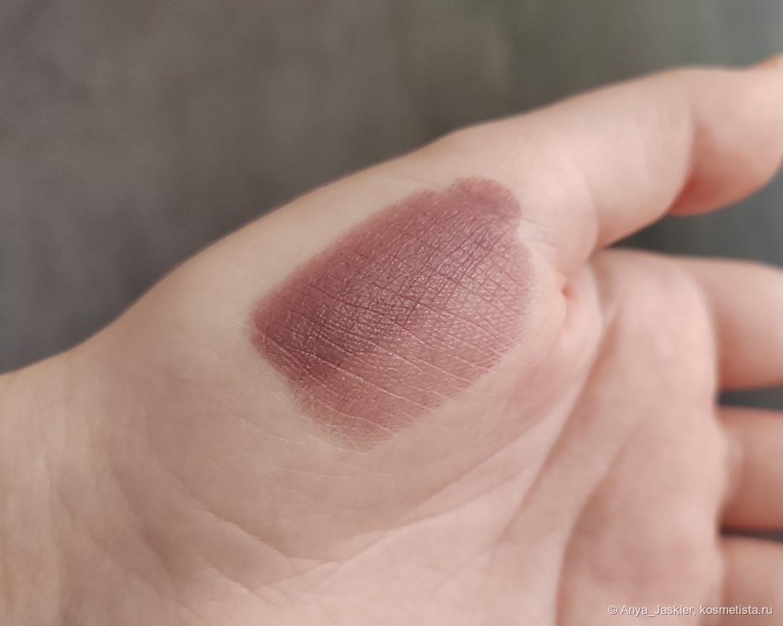 По текстуре стик плотный, достаточно пигментированный, явный цвет отдаёт уже с одного слоя, хотя я предпочитаю 2-3. Аромат у стика косметический сладкий, после нанесения я его не ощущаю; вкуса нет. Финиш полуматовый, полную матовость можно получить, сняв верхний слой салфеткой. Наносится легко, форма помады позволяет прокрасить контур без использования карандаша или кисти. Цвет холодный серо-коричневый с нотками сиреневого, при разном освещении выглядит на мне от оттенка молочного шоколада до серо-лилового.