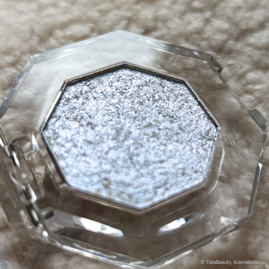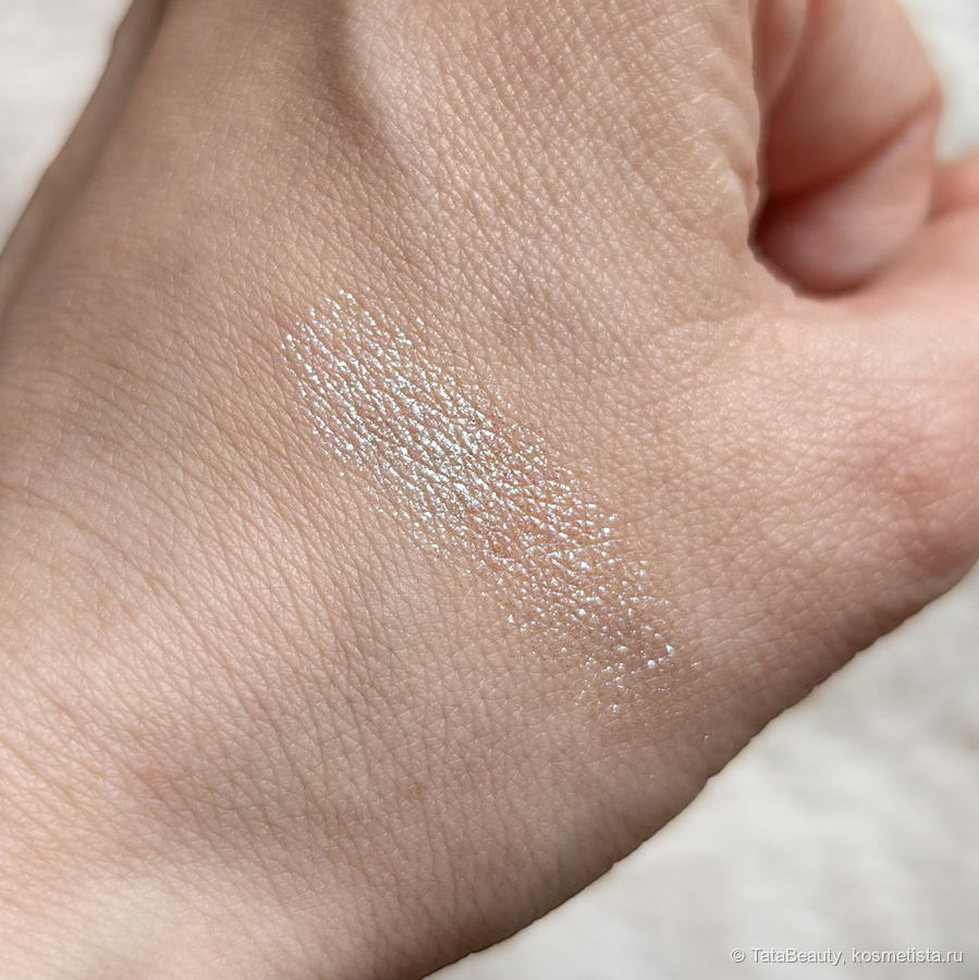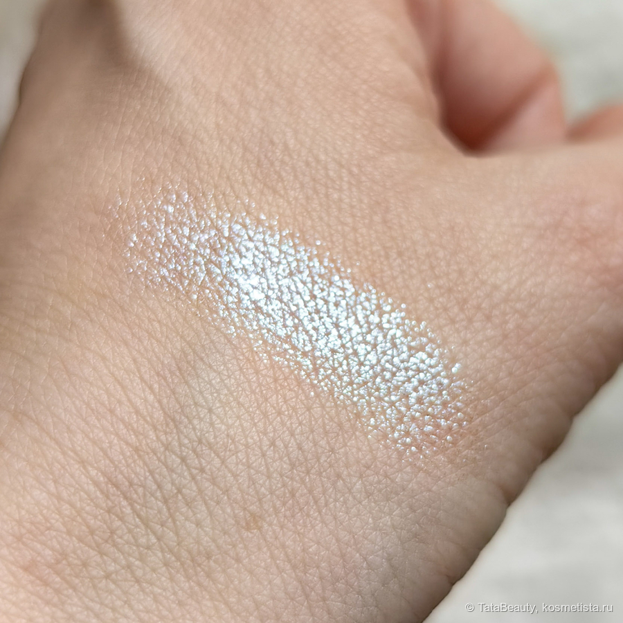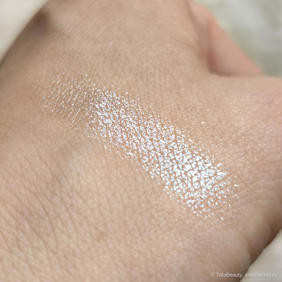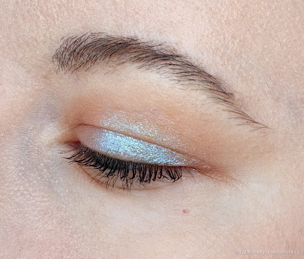В палитре 5 спарклов. Оттенок 01 Control — это интересный мультихром, на первый взгляд он белый, но после нанесения он играет от основного голубого до розового и фиолетового при определённом свете. В основном видно голубой. Выглядит красиво и нарядно. Это яркий и акцентный оттенок, я могу носить его и в дневном макияже. У меня небольшое нависшее веко и спарклы видны в основном при моргании.