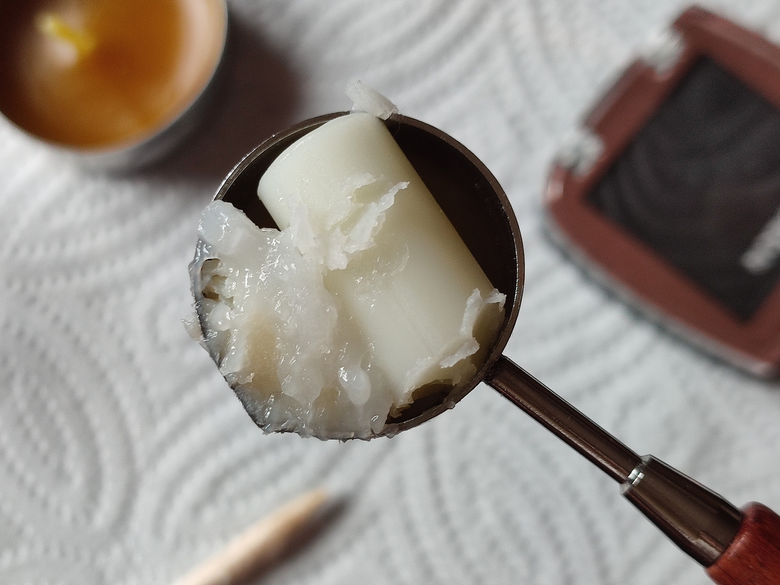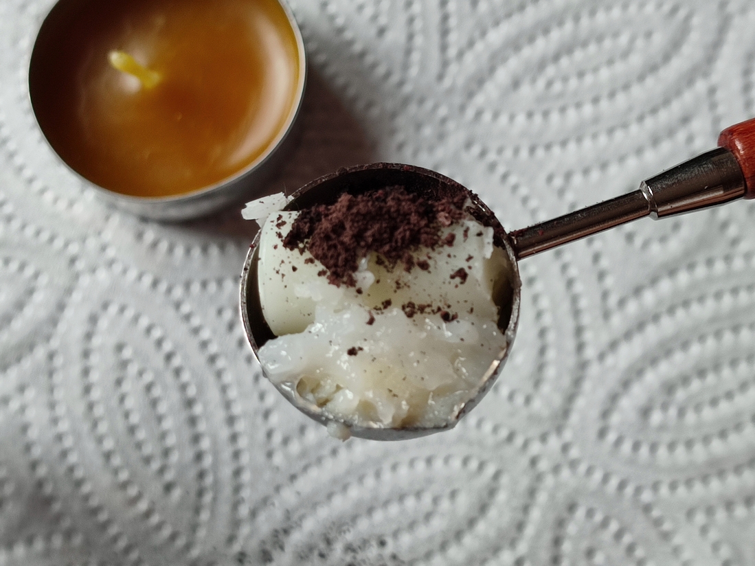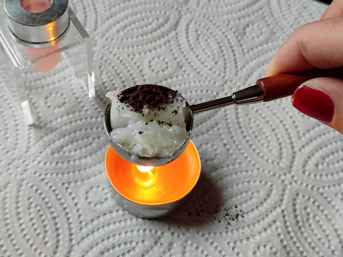 Зажигаем свечку и тихонько плавим, постоянно помешивая. Главное не перегреть, чтоб не было дымления и кипения.