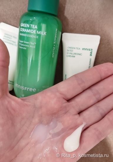 Полный состав будет в блоке внизу поста, тут же отмечу, что из полезного у нас есть: ниацинамид, несколько форм гиалуроновой кислоты, витамин Е, церамиды, экстракт и масло семян зелёного чая, гидрогенизированное масло рисовых отрубей, а в конце списка даже пептид затесался.