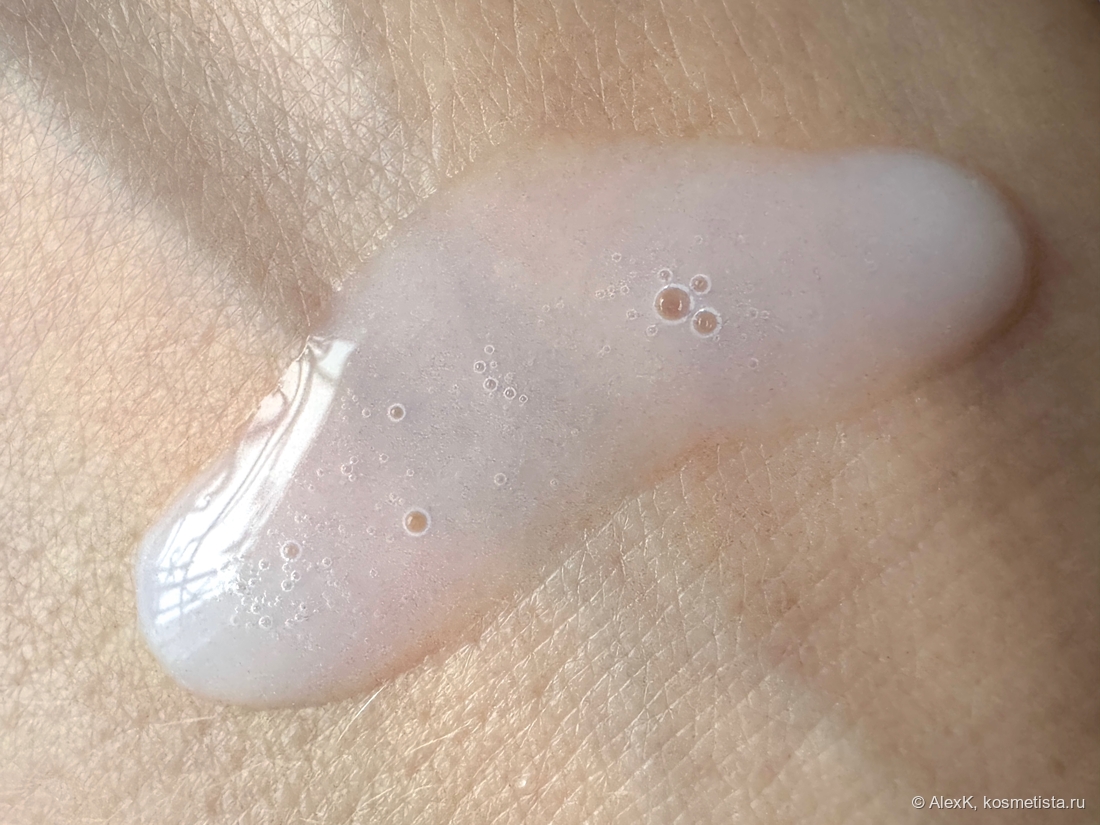 Текстура… странная. На первый взгляд — жидкая полупрозрачная водичка с белесо-голубоватым оттенком. Но при распределении оказывается жирной и тягучей. Размазывается с трудом даже по коже, подготовленной тонером.